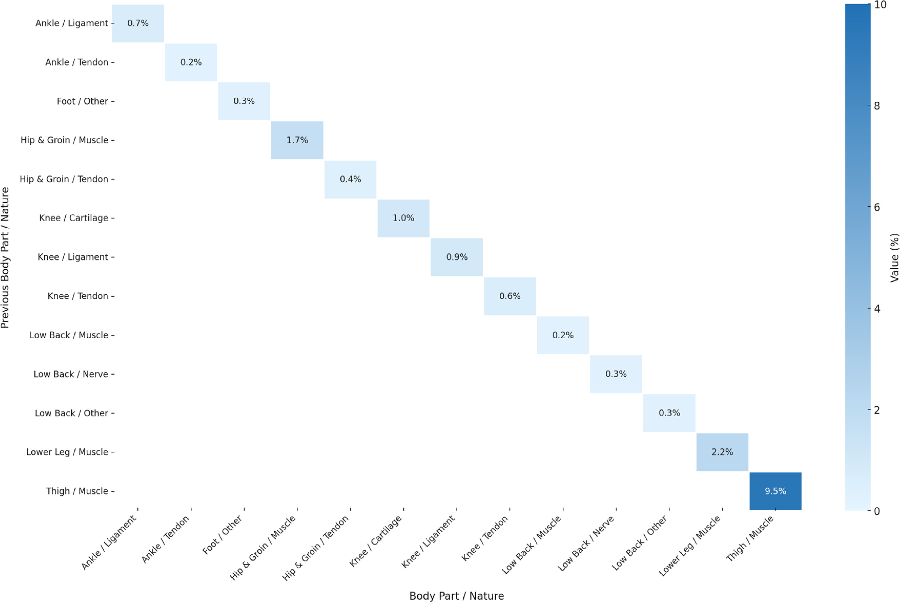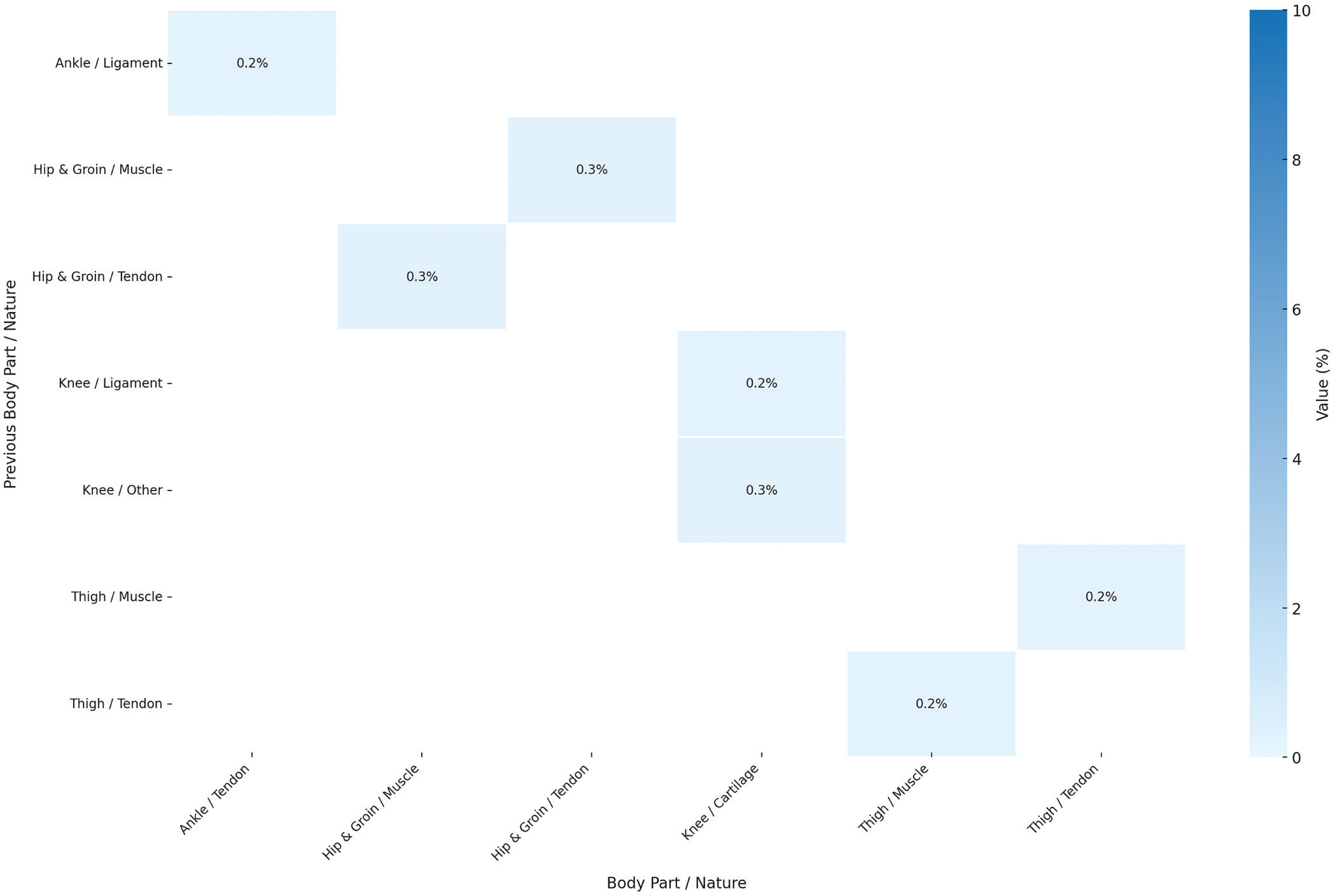 Probability distribution of subsequent injury for same body part and same nature considering previous n (=1) injury, showing relation between body parts and nature. Darker blue colors indicate greater influence (probability) of previous injury on the subsequent injury. The graph excludes injuries below 0.2% probability from the result. Sample Size: 1,599 cases of subsequent injuries