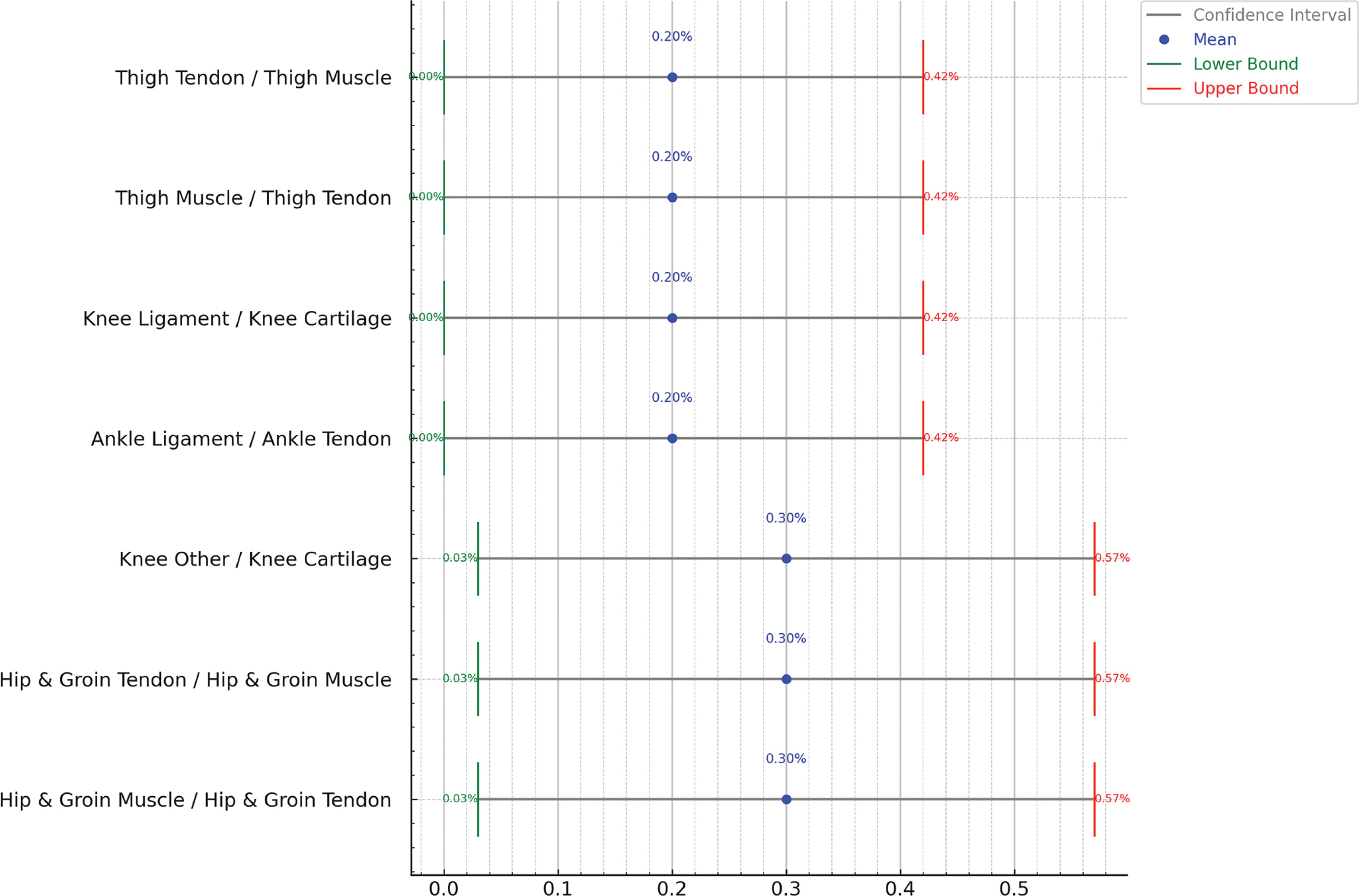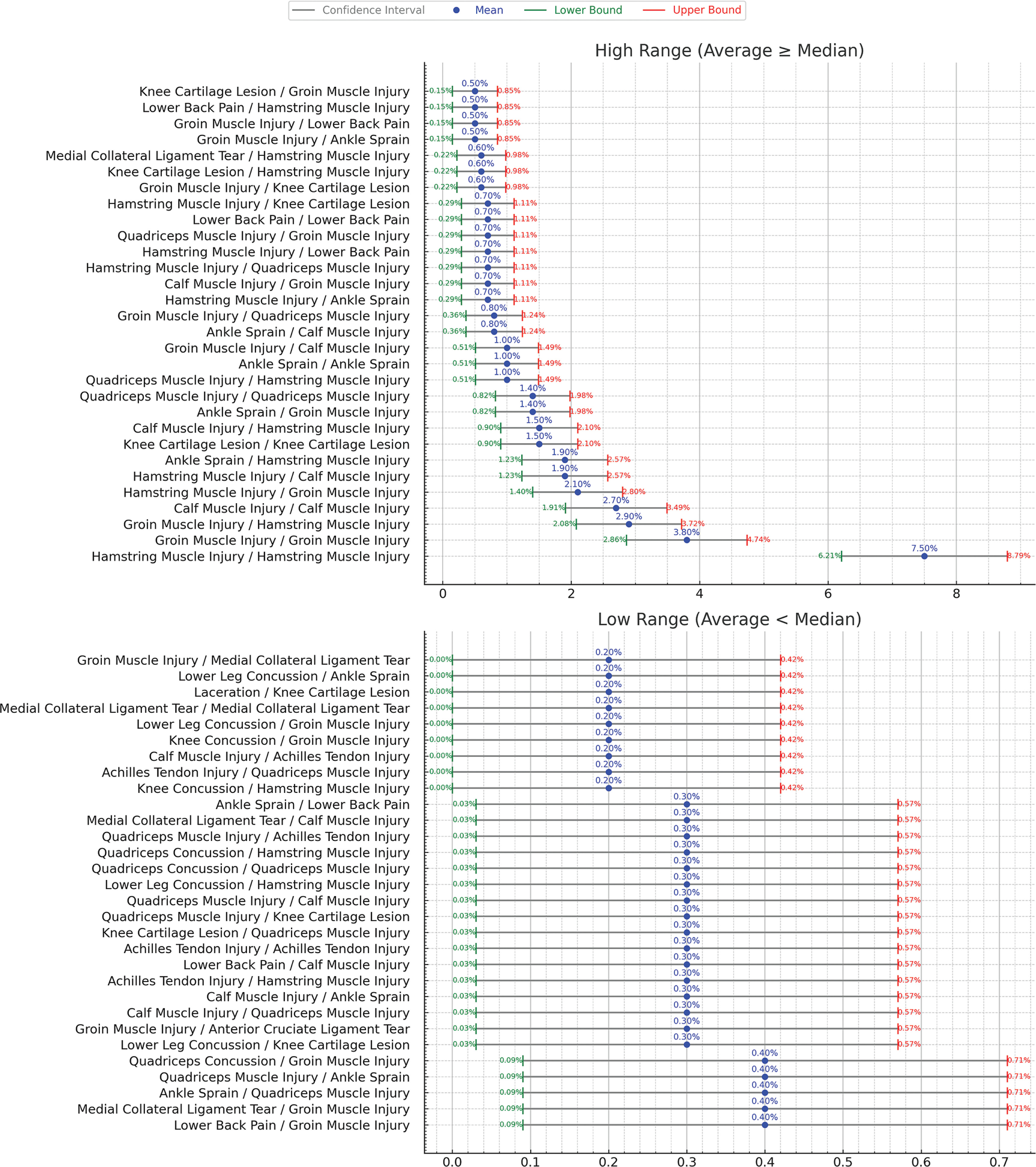 Figure 4 explores injuries that occurred in the same body part but with a different nature from the previous injury. The findings show that these injury combinations are quite rare such as Hip and Groin Tendon Injury occurring subsequently to Hip and Groin Muscle Injury (0.3%) with confidence interval of ± 0.3%. Other injury combinations are shown in Figure 4. Figure 5 shows all the confidence interval for the subsequent injuries to the same body part but different nature.
