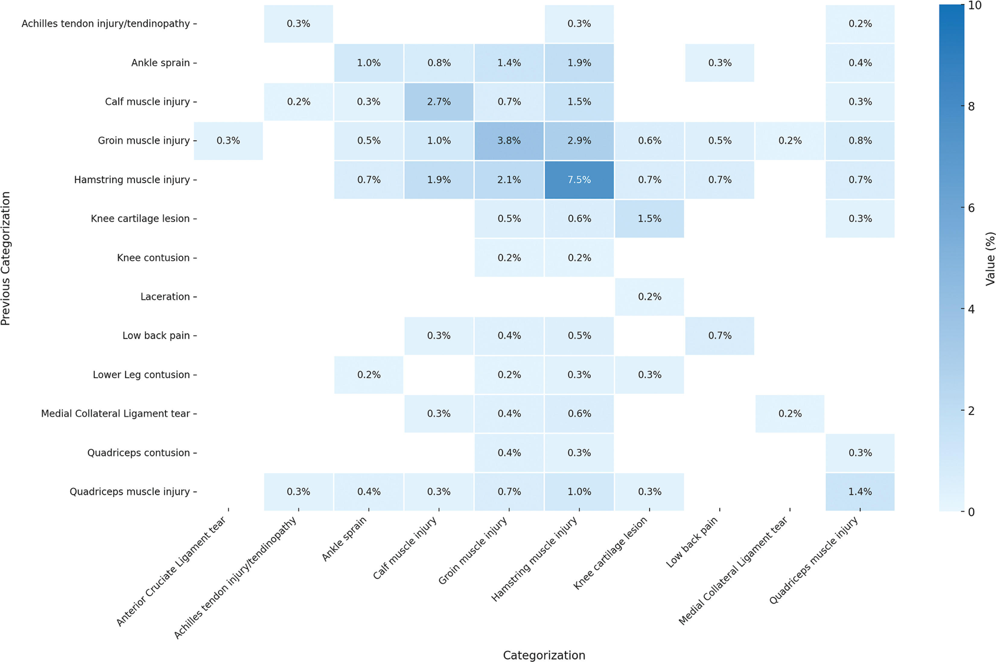 Probability distribution of subsequent injury for same or different categorization considering previous n (=1) injury. Darker blue colors indicates greater influence (probability) of previous injury on the subsequent injury. The graph excludes injuries below 0.2% probability and injuries with “Unsure” and “Others” categorization from the result. Sample Size: 1,599 cases of subsequent injurie. MCL: Medial Collateral Ligament. ACL: Anterior Cruciate Ligament.