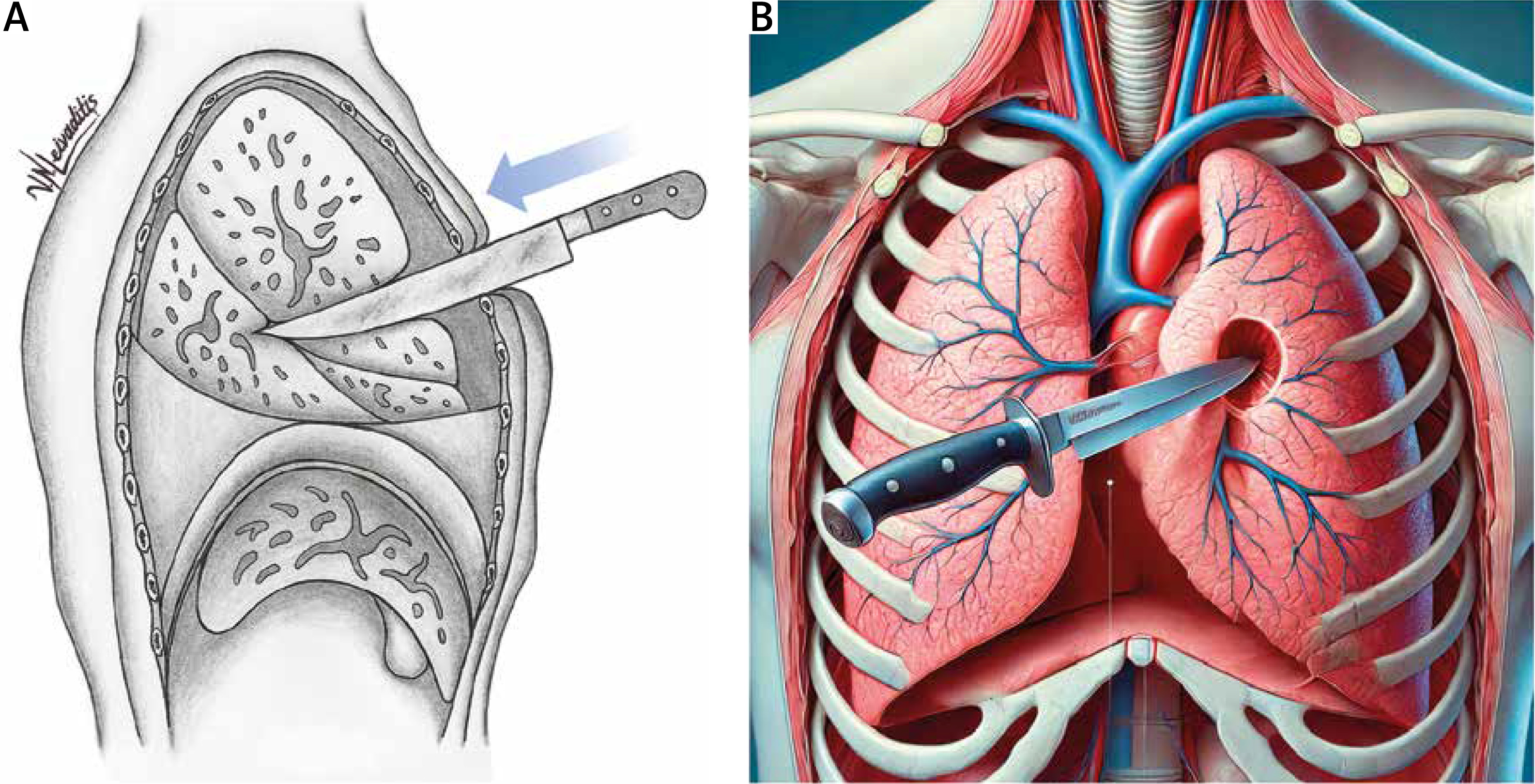 Diagram illustrating a penetrating thoracic injury inflicted by a knife, demonstrating the path of the blade through the thoracic cavity