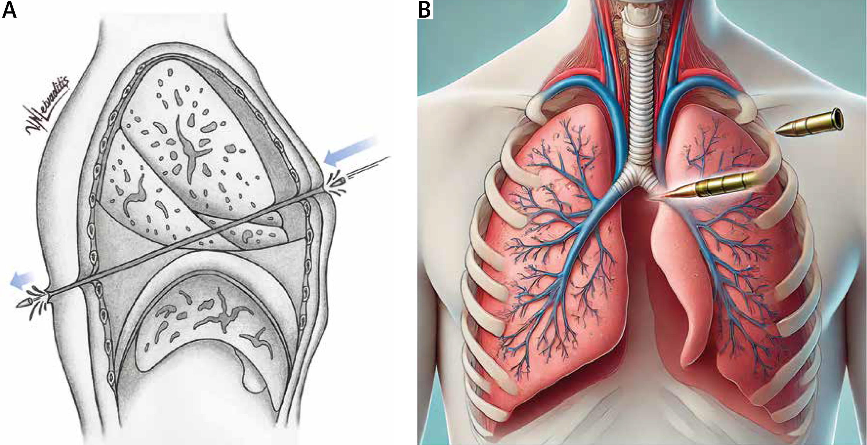 Gunshot wounds can be either penetrating (where the bullet does not exit the body) or perforating (where the bullet passes through the body). These injuries cause extensive tissue destruction along the projectile’s path (Figure 2). When a high amount of energy is transferred to the lung parenchyma, cavities form. The ‘permanent pulmonary cavity’ or ‘tunnel of attrition’ [48] represents the projectile’s path through devitalized tissue, manifesting as a pulmonary laceration. The ‘temporary cavity’, on the other hand, refers to tissue contusion caused by alveolar hemorrhage and edema in the surrounding tissues due to energy absorption rather than the direct trajectory of the projectile [45, 49].