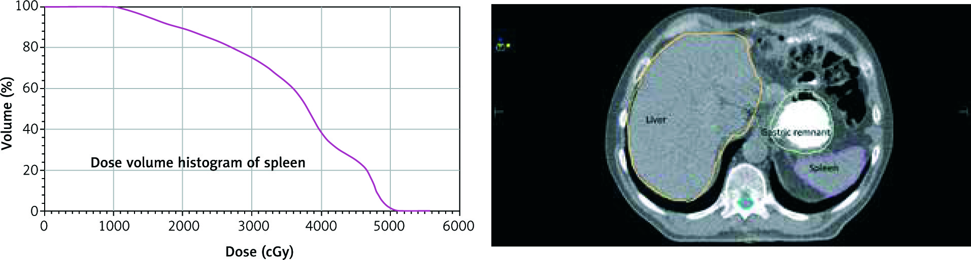 The spleen was contoured, and dose-volume histogram (DVH) parameters were obtained using the “Monaco 3.30.02 Planning System” (Elekta Medical Systems, Stockholm, Sweden) (Fig. 1). DVHs were reported in terms of mean splenic dose (MSD), and the percentage of splenic volume receiving at least 5 Gy (V5), 10 Gy (V10), 15 Gy (V15), and 20 Gy (V20). MSD, V5, V10, V15, and V20 (stratified at increments of 10%) were compared among patients with and without severe lymphopaenia [19].