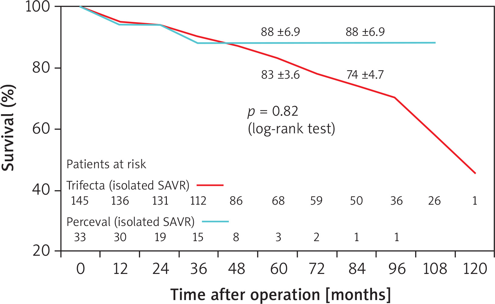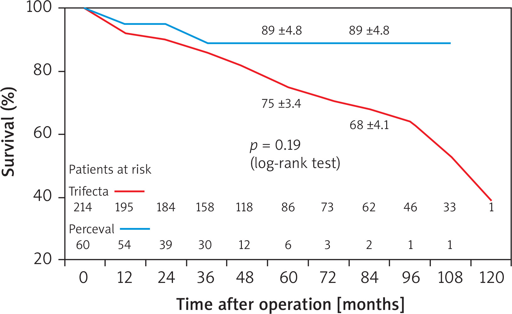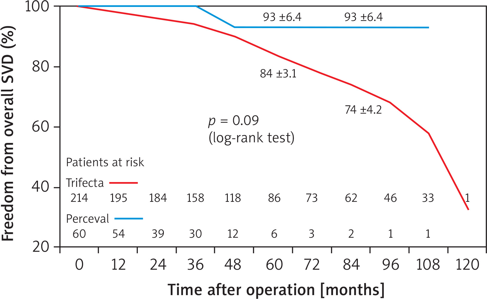 Cumulative event-free survival, including all-cause death, freedom from endocarditis, from thromboembolism, from redo operation and from overall SVD, was 55 ±4.2% in the Trifecta group vs. 55 ±2.3% in the Perceval group, and there were no statistically significant differences between the two types of prosthesis either in the Mantel-Cox test or in the Cox model regression.