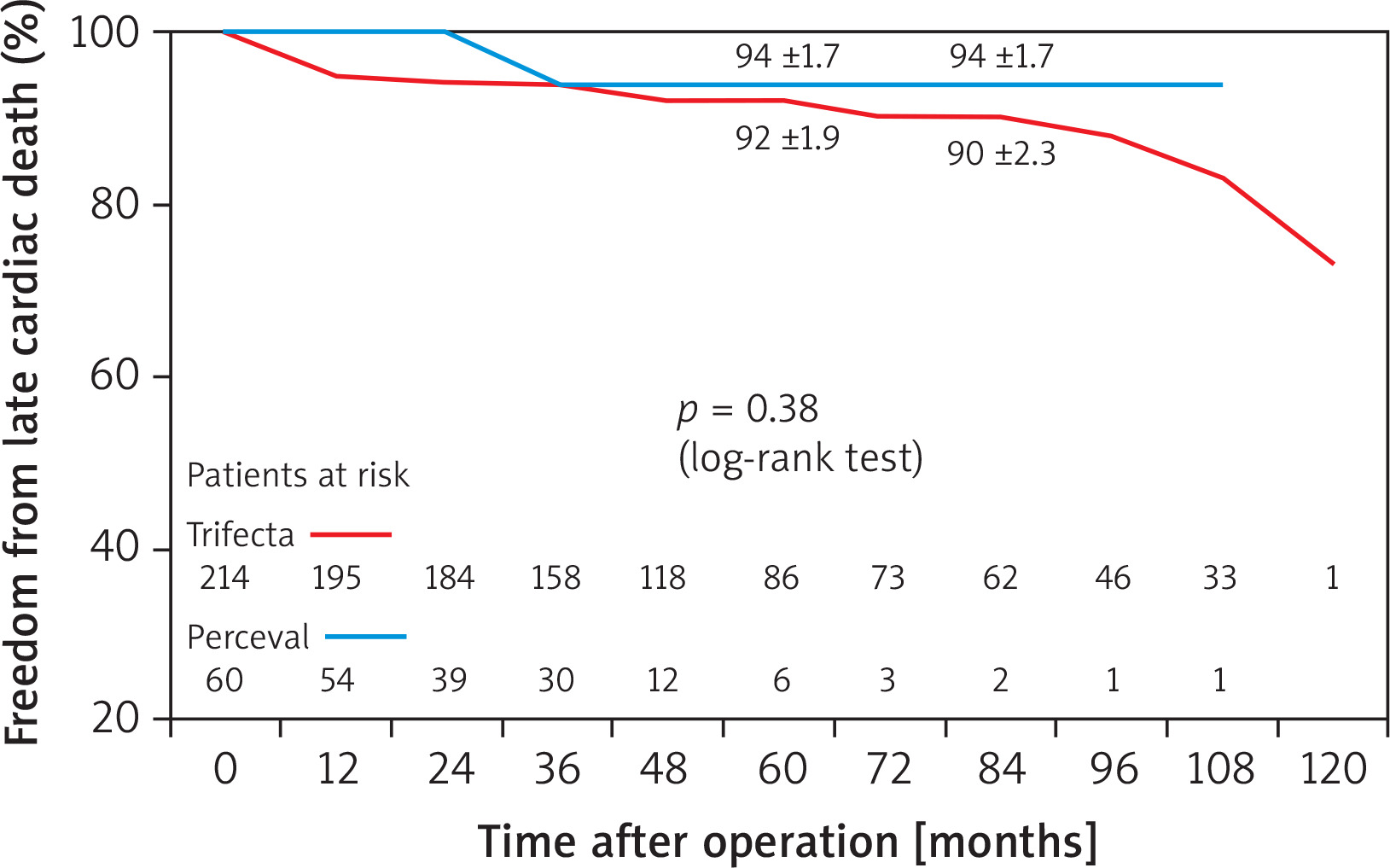 Mean follow-up was 58.9 ±34.1 and 43.5 ±21.1 months after Trifecta and Perceval valve implantations, respectively. Follow-up was 96% complete; 12 patients (11 in Trifecta group, 1 in Perceval group) were lost or did not complete the follow-up. At 7 years, actuarial survival was 68 ±4.1% in the Trifecta group vs. 89 ±4.8% in the Perceval group (p = 0.19) (Figure 1), and freedom from late cardiac death was 90 ±2.3% vs. 94 ±1.7% (p = 0.38) (Figure 2). There were 67 late deaths (24.4%) out of 274 patients who survived after SAVR; 23 of them (34%) were due to cardiac causes. Echocardiographic data collected during follow-up for the evaluation of transprosthetic gradients and SVD were complete in 180 patients.
