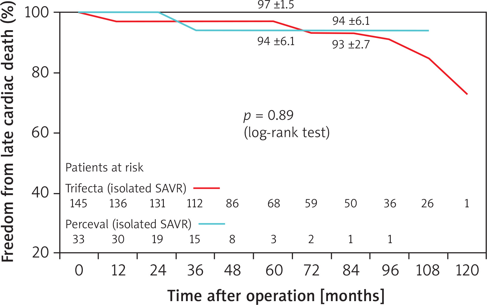 Freedom from cardiac death in patients undergoing isolated SAVR with Perceval and Trifecta bioprosthesis implants