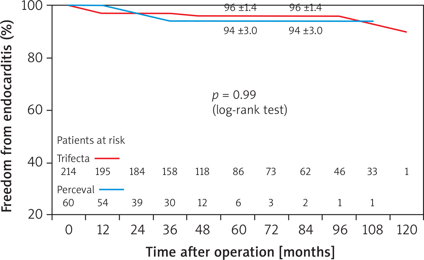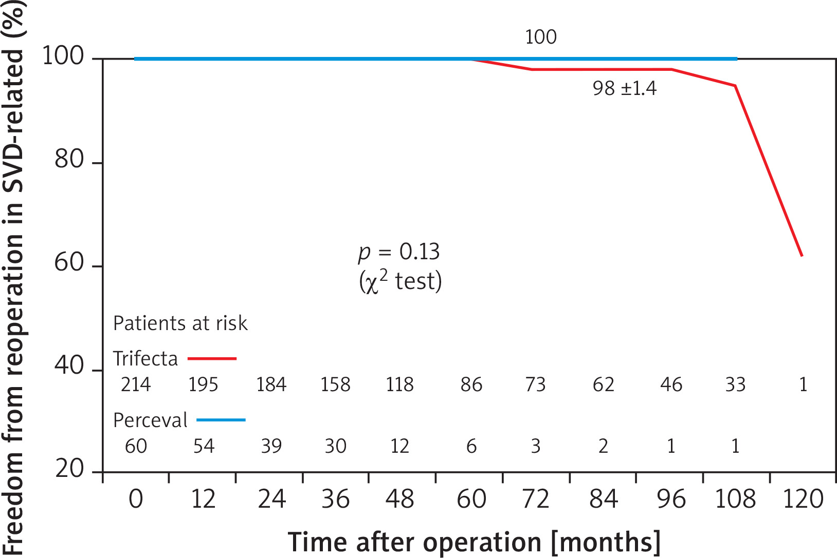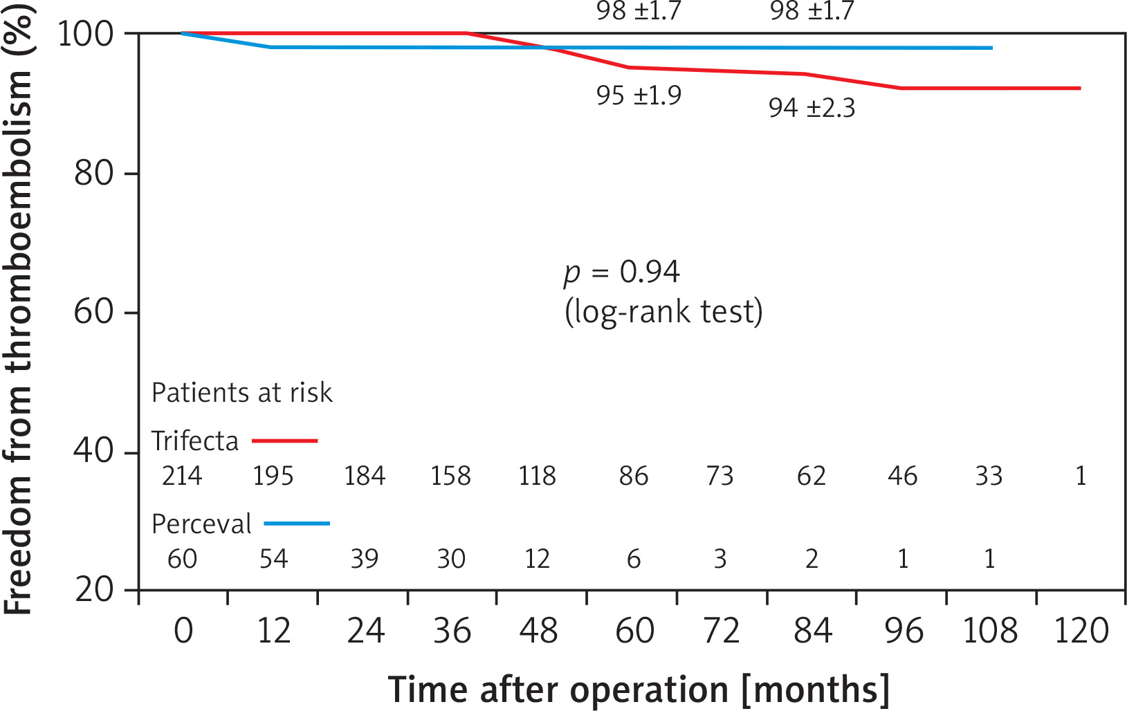 Freedom from endocarditis and redo operation due to endocarditis (94 ±3.0% vs. 96 ±4.0%) (Figure 5), from thromboembolism (94 ±2.3% vs. 98 ±1.7%) (Figure 6), and from redo operation due to SVD (98 ±1.4% vs. 100%) (Figure 7) were similar in both groups (Trifecta vs. Perceval) of patients. There was a non-significant tendency for freedom from redo operation in favor of the Perceval prosthesis (no patients re-operated in the Perceval group, 8 patients [3.7%] in the Trifecta group [surgical redo operations = 2, valve-in valve procedures = 6]) (p = 0.13).