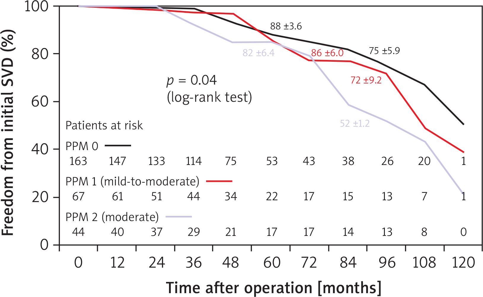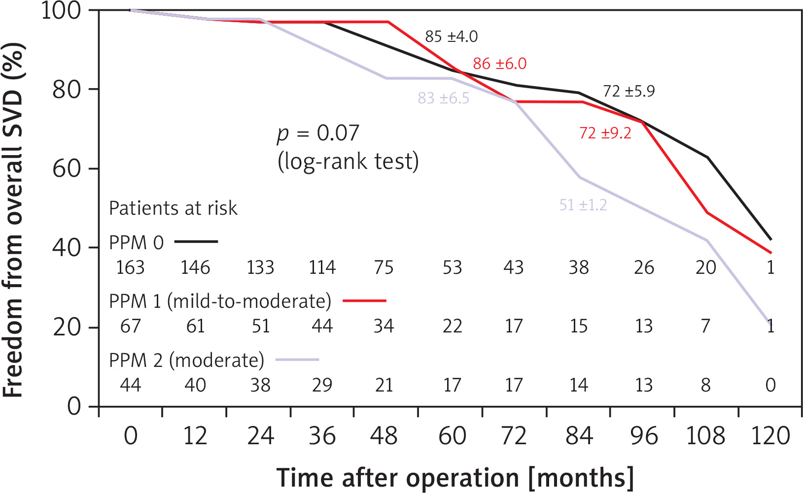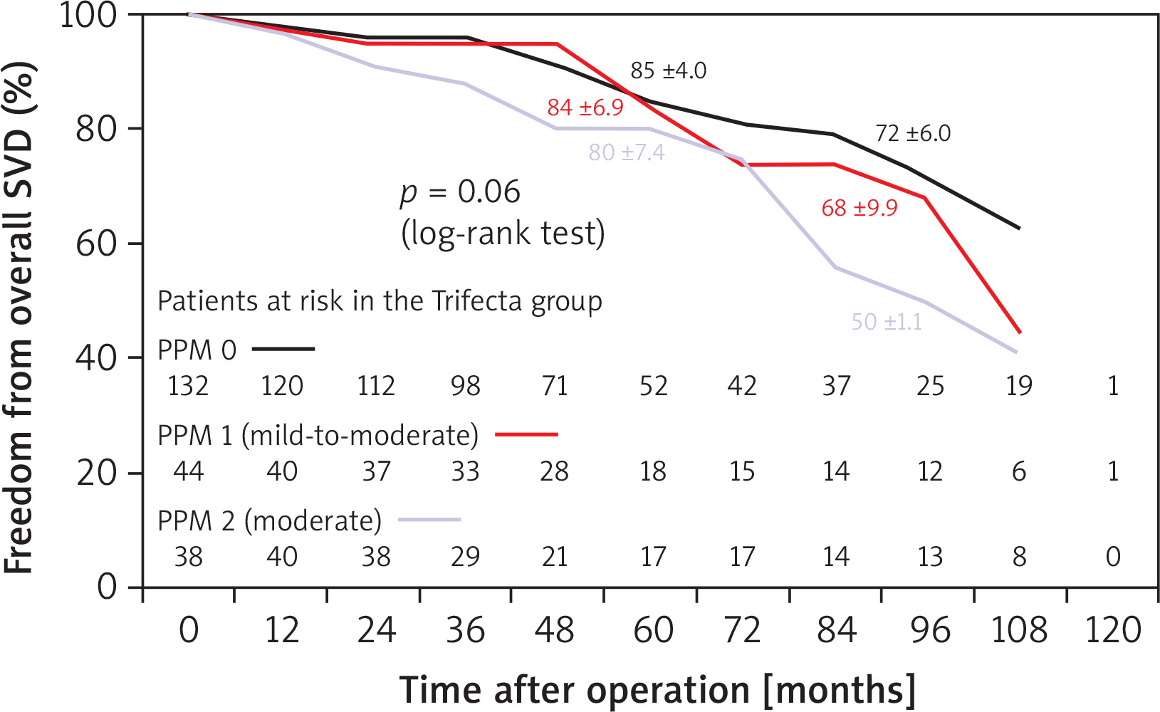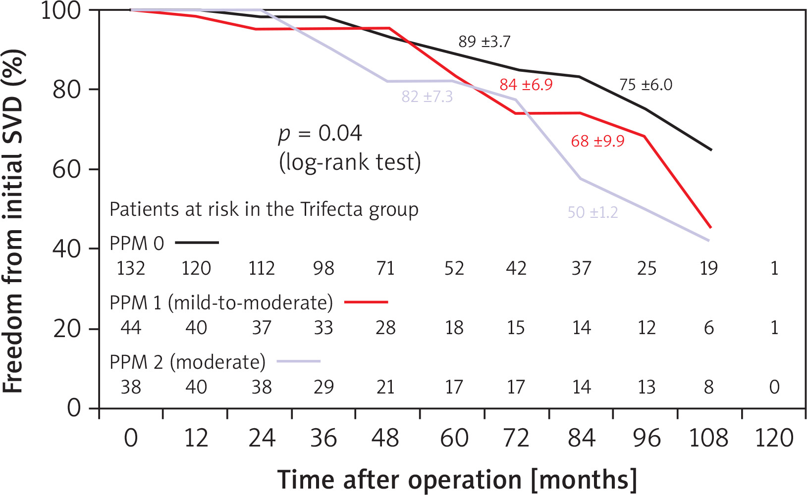 In the Cox model analysis, independent predictors of SVD were the Trifecta prosthesis itself (HR = 22.4; p = 0.002) and moderate grade PPM, i.e., PPM 2 (HR = 2.3; p = 0.03) (Table IV). The Trifecta valve (HR = 20.5; p = 0.003) and moderate grade PPM (HR = 2.5; p = 0.02) were also independent predictors of early stages, i.e., 1 and 2S, of SVD (Table V). Moderate PPM showed in the medium and long-term follow-up a negative impact on the freedom from overall SVD and from its initial stages also in the Mantel-Cox test (Figures 9, 10). Given the higher incidence of SVD in the Trifecta group, we reported overall and initial freedom from SVD analyzed only in this patient group (Figures 11, 12).