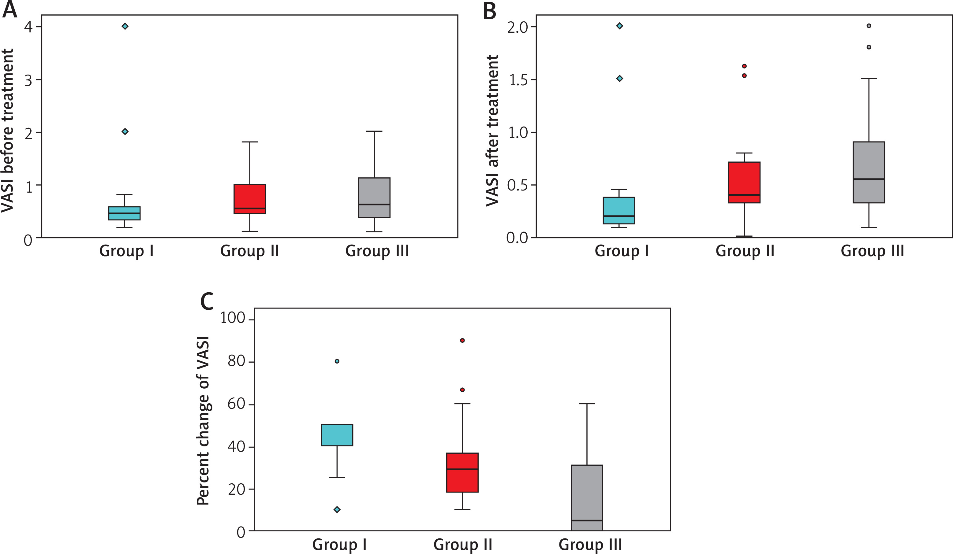 Boxplot chart for comparison between the three studied groups regarding VASI before treatment (A), after treatment (B), and regarding percent change of VASI (C)