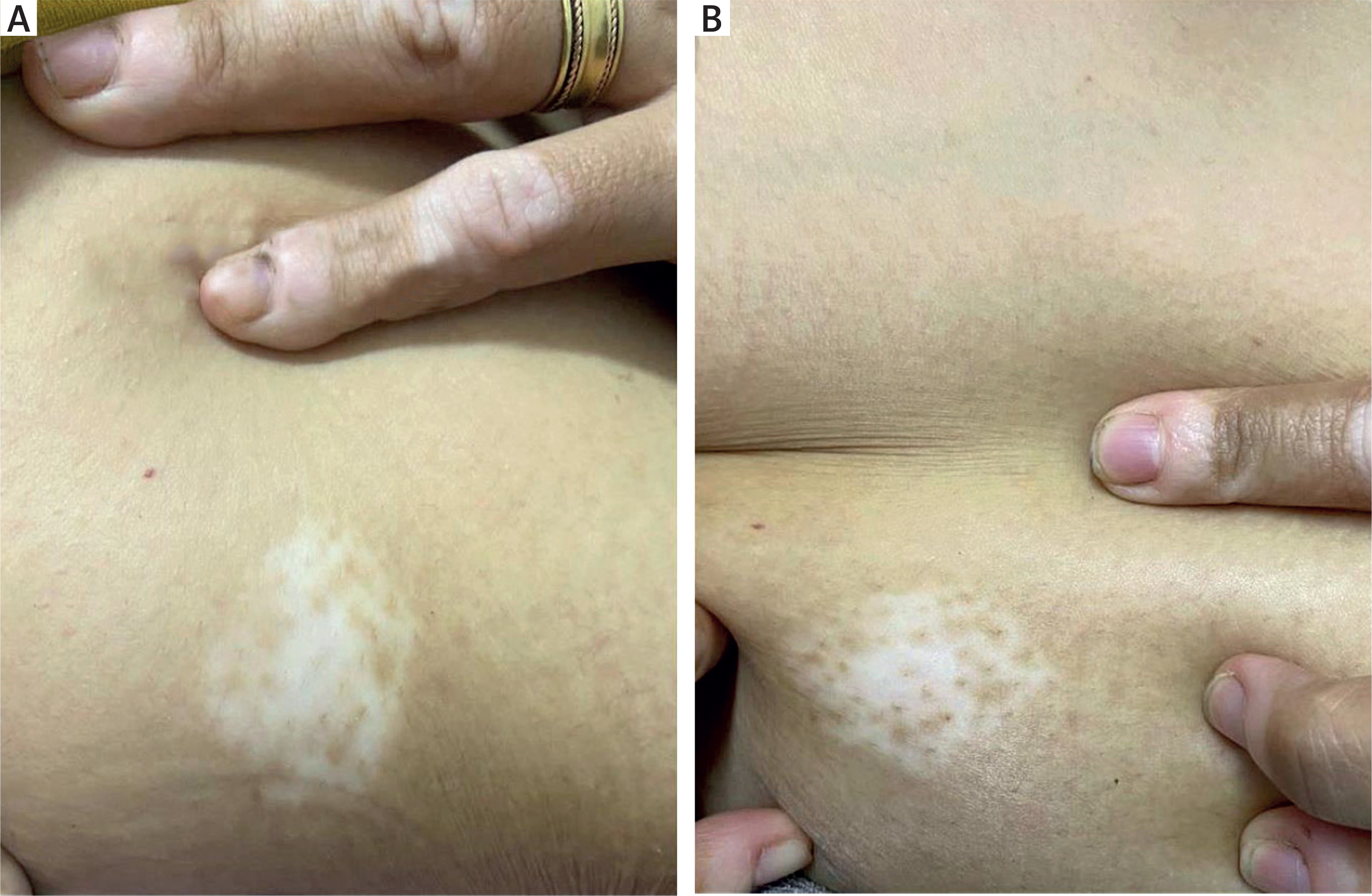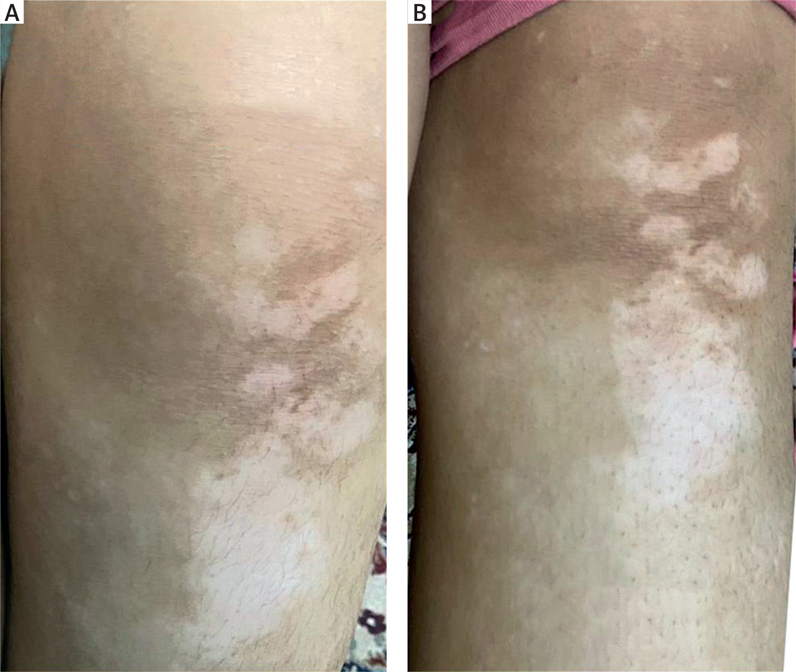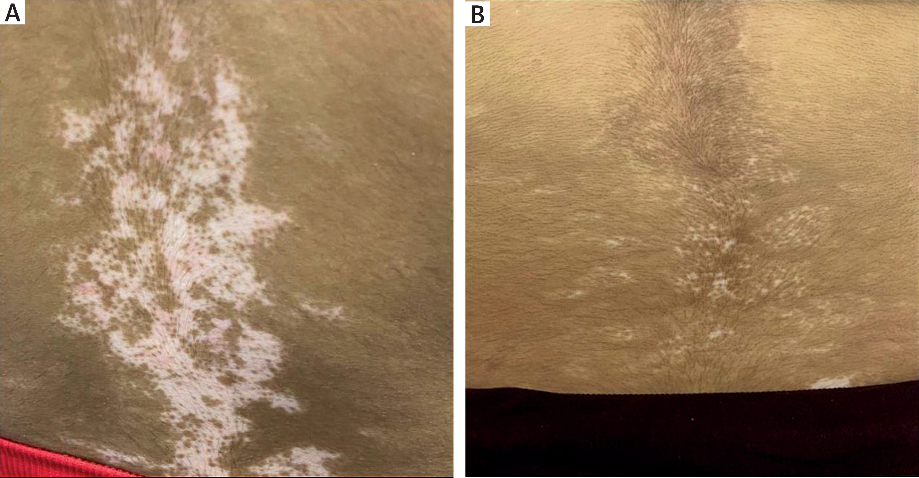 A 19-year-old female patient from group 1 underwent six treatment sessions of microneedling followed by topical application of 5-FU. Pre-treatment image shows clearly defined areas of depigmentation, while post-treatment image reveals an excellent improvement, achieving approximately 80% repigmentation observed (Figure 2).