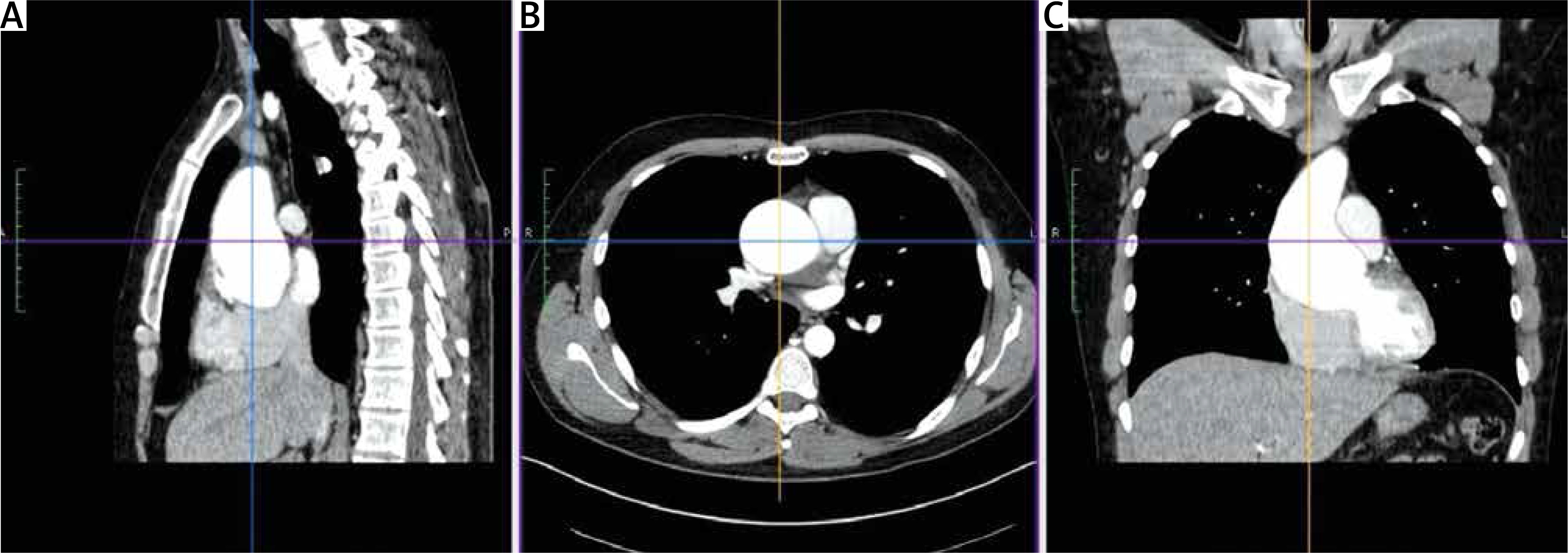The key element of proper preparation of the patient for the surgery is the performance of chest computed tomography (CT) with 3D reconstruction to assess the ratio of the aneurysm to the sternum surface and the type of aortic position (right, central, left). Such assessment facilitates and streamlines the decision process about the skin incision site and the transverse cut of the sternum (Figure 1). Transesophageal echocardiography remains the most important functional examination in the assessment of aortic valve insufficiency and is essential in the intraoperative assessment of the competence of the performed reimplantation (Figure 2).