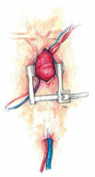 Central cannulation is performed as the first choice. Heparin is administered at a dose of 3 mg/kg body weight intravenously titrated to the activated clotting time higher than 450 s. In the area of the brachiocephalic trunk, two Ti-Cron 2-0 purse - string sutures are applied. The aorta is cannulated using an EOPA cannula (Medtronic Inc, Minneapolis, MN, USA) and airlessly connected to the extracorporeal artery line. Venous outflow is provided by insertion of an MC2X two-stage cannula (Medtronic, Inc) into the right atrium. The cannula is then pulled out of the chest under the sternum through a small handrail under the xiphoid process, through which the chest tube is carried out after the surgery (Figure 4). At this stage, it is possible to start extracorporeal circulation. With the emptied heart, a 16 F vent (Medtronic Inc, Minneapolis, MN, USA) is inserted through the right superior pulmonary vein into the left atrium. The patient’s body temperature is maintained at 34°C.