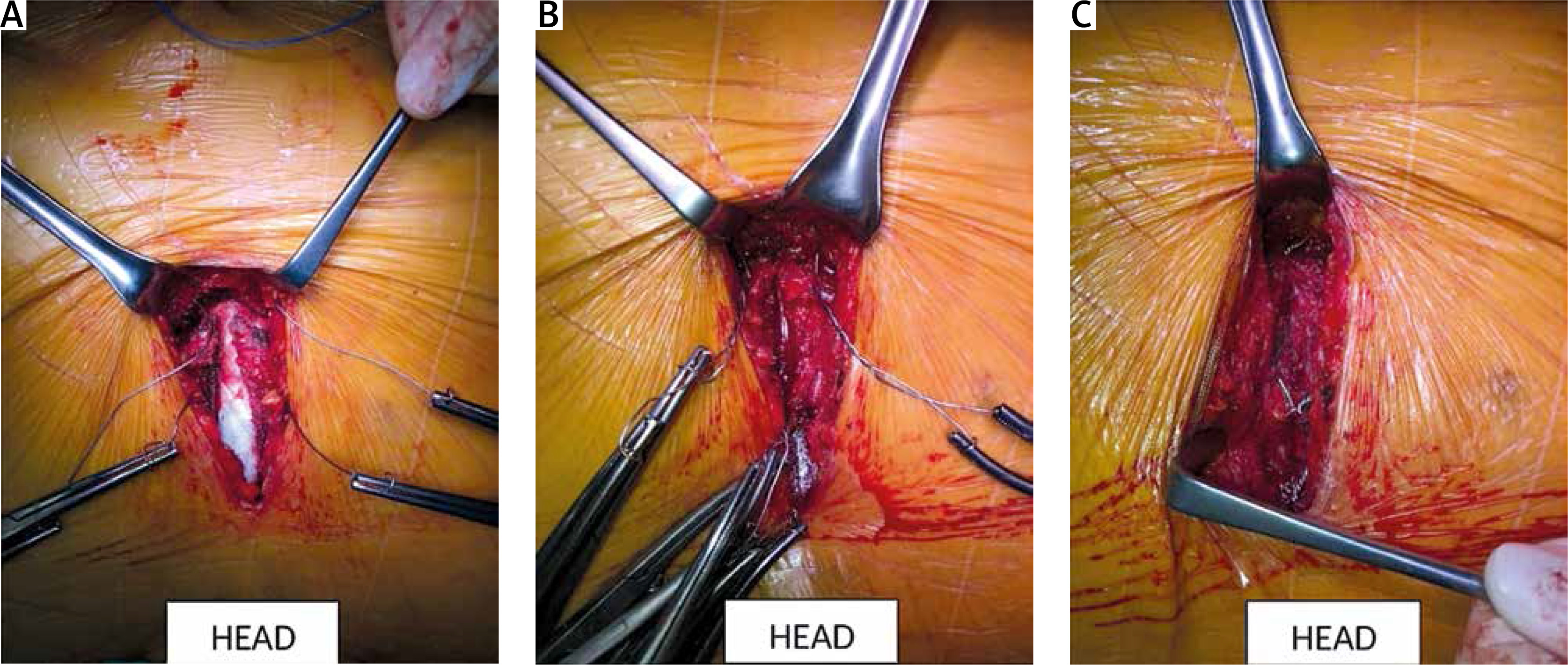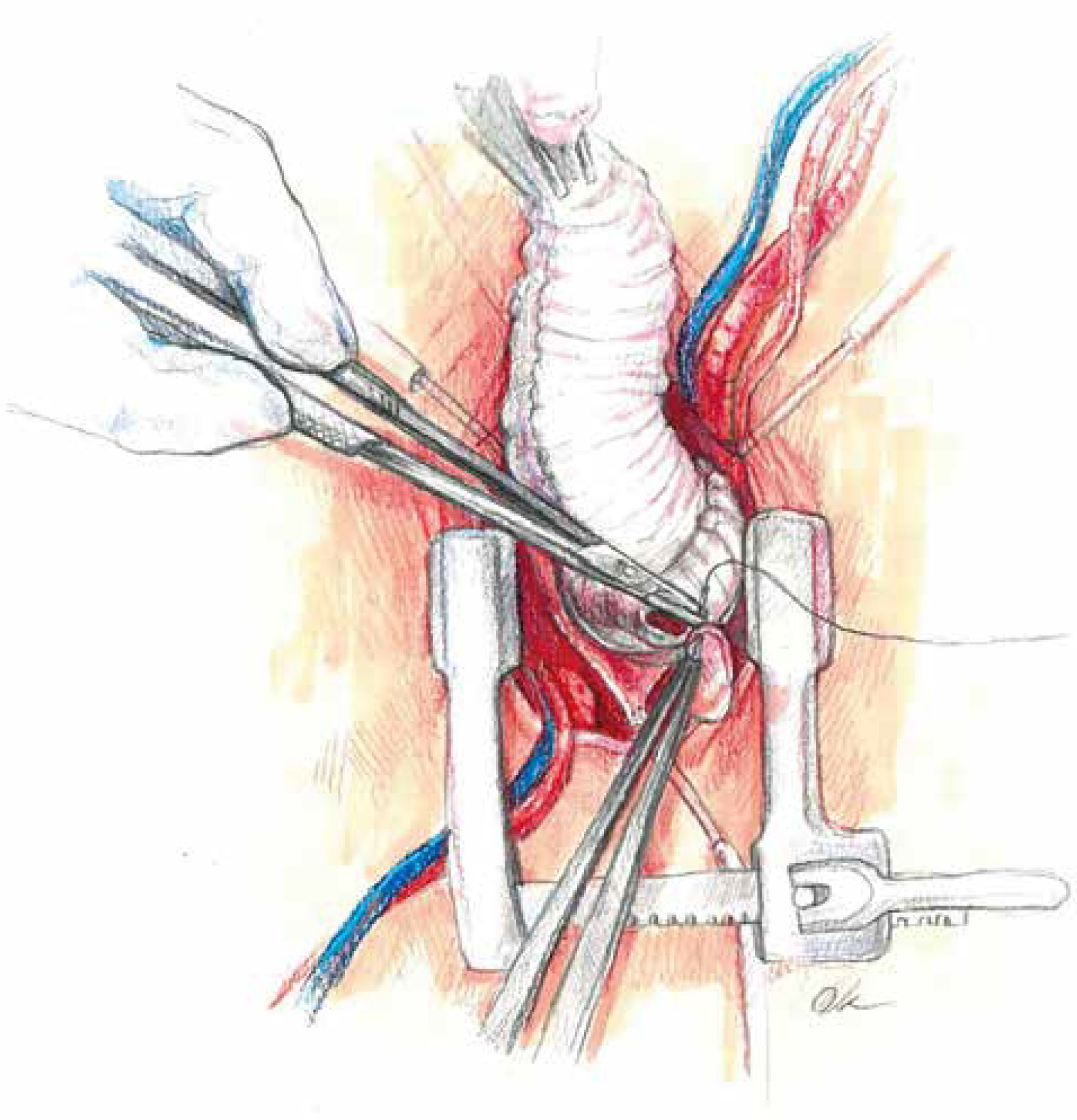 Modern cardiac surgery offers a variety of less invasive techniques in the surgical treatment of complex heart and aortic disorders. It has been proven that reducing the invasiveness of the procedure allows for pain reduction and acceleration of postoperative convalescence. The overarching goal of the treatment is to shorten the hospitalization period and to enable the patient’s quick return to society [6–8]. The current paper presents a detailed description of the technique of aortic valve reimplantation as described by David with the difference being access through a V-shaped ministernotomy. Experience in performing partial ministernotomy has been gained thanks to an extensive program of minimally invasive aortic valve surgery. In the first stage, access was performed using a V ministernotomy, then a J-shaped approach, and now, access exchanges are performed using an anterolateral right minithoracotomy. The V-shaped upper ministernotomy, due to the bilateral opening of both cut parts of the sternum, enables good visibility of both the aortic root and the brachiocephalic trunk area. The most important part of this particular operation is good visualization and elevation of the aorta. This is achieved by pulling the pericardial sac up to the level of the chest. Another important issue is properly performed cannulation. Central cannulation is the technique of choice but peripheral cannulation should be at least as safe. An important element is very high cannulation of the aorta, even behind the brachiocephalic trunk. This is possible thanks to the use of flexible cannulas. This type of cannulation leaves a large unobscured space for clamping the aorta. In cases where arch cannulation is not possible, the right subclavian approach is used. Due to the possibility of vascular complications, femoral arterial access is avoided in patients with peripheral vascular disease. Retrograde arterial perfusion is associated with a higher risk of stroke and dissection in the case of minimally invasive mitral valve surgery but may be considered after no atherosclerotic lesions in the aorta were found at CT [9]. An alternative to the reservoir cannula in the right atrium is peripheral femoral vein cannulation, most often using the percutaneous technique [9, 10]. By choice, the vent is inserted through the right superior pulmonary vein and led out together with the venous cannula under the xiphoid process. Due to this solution, there are no unnecessary tools or cannulas within the narrow field. Both the venous cannula and the vent are pulling the right atrium down, and in particular the right atrial appendage, greatly improving the visibility of the aortic root. The main stage of the operation is the sequential reimplantation of the aortic valve and the creation of a new aortic root. The neo-root is made of a vascular graft. The most commonly used grafts are pre-formed Valsalva sinuses [10–13]. Prostheses with embedded sinuses imitate a native aortic bulb. This design facilitates the reimplantation of the leaflets and commissures inside in the prosthesis. The native valve ring is fixed and stabilized by sutures with pledgets, which are inserted from the left ventricular side. Then, commissures and valve leaflets are sewn onto the wall of the prosthesis. In approximately 5% of root aneurysms, a bicuspid aortic valve (BAV) is found, which does not constitute a contraindication for its reimplantation [13]. An equally important element of the operation as the reconstruction of the aortic root geometry is the anastomosis of the coronary vessels in such a way that, after removing the clamp, they do not accidentally bend and the flow in the coronary circulation is impaired. Therefore, cutting openings for the orifices is performed on a partially filled heart. Properly and carefully performed hemostasis is important at each stage of the procedure. After performing the coronary anastomoses, the surgeon is unable to re-inspect the posterior part of the anastomosis and the place where the left coronary button is sewn onto the prosthesis. Biological glue is used to seal the joints along the sutures line. If lengthy aortic root repair is predicted, Custodiol cardioplegic solution is the first choice. In other cases myocardial protection is ensured by cold blood cardioplegia [14]. A very important part of the procedure is the rigid fixation of the sternum with metal sutures. In the described technique, the breastbone is cut in 3 places and must be carefully stabilized with metal wires. In order to prevent infection of the sternum, a gentamicin sponge is applied [15]. The development of medical technologies and equipment used for operations causes that the cuts are becoming more precise and smaller. It has a big impact on the final results of the treatments [16]. Performing David’s operation with V-shape ministernotomy is feasible and safe in a selected group of patients. The experience gained in performing aortic valve replacement using a minimally invasive technique is not without significance. During the surgery via the mini approach, one has to think about how to make this procedure easier. Firstly, central cannulation is important, especially the venous cannula, which is pulled out under the sternum. This maneuver creates more space between the aortic root and right atrium. Secondly, one has to use tension sutures, which are anchored and attached at the level of the coronary buttons and all the commissures. This continuous traction provides good visibility to the leaflets and upper margin of the aortic annulus and simplifies all the measurements. All of the above tips originate from our minimally invasive aortic valve surgery experience. From our experience no contraindications exist to minimally invasive aortic root surgery other than the size of the aneurysm (> 70 mm), chest wall defects, morbid obesity, re-do surgery and congenital heart disease with abnormal origin of the coronary arteries or extra coron