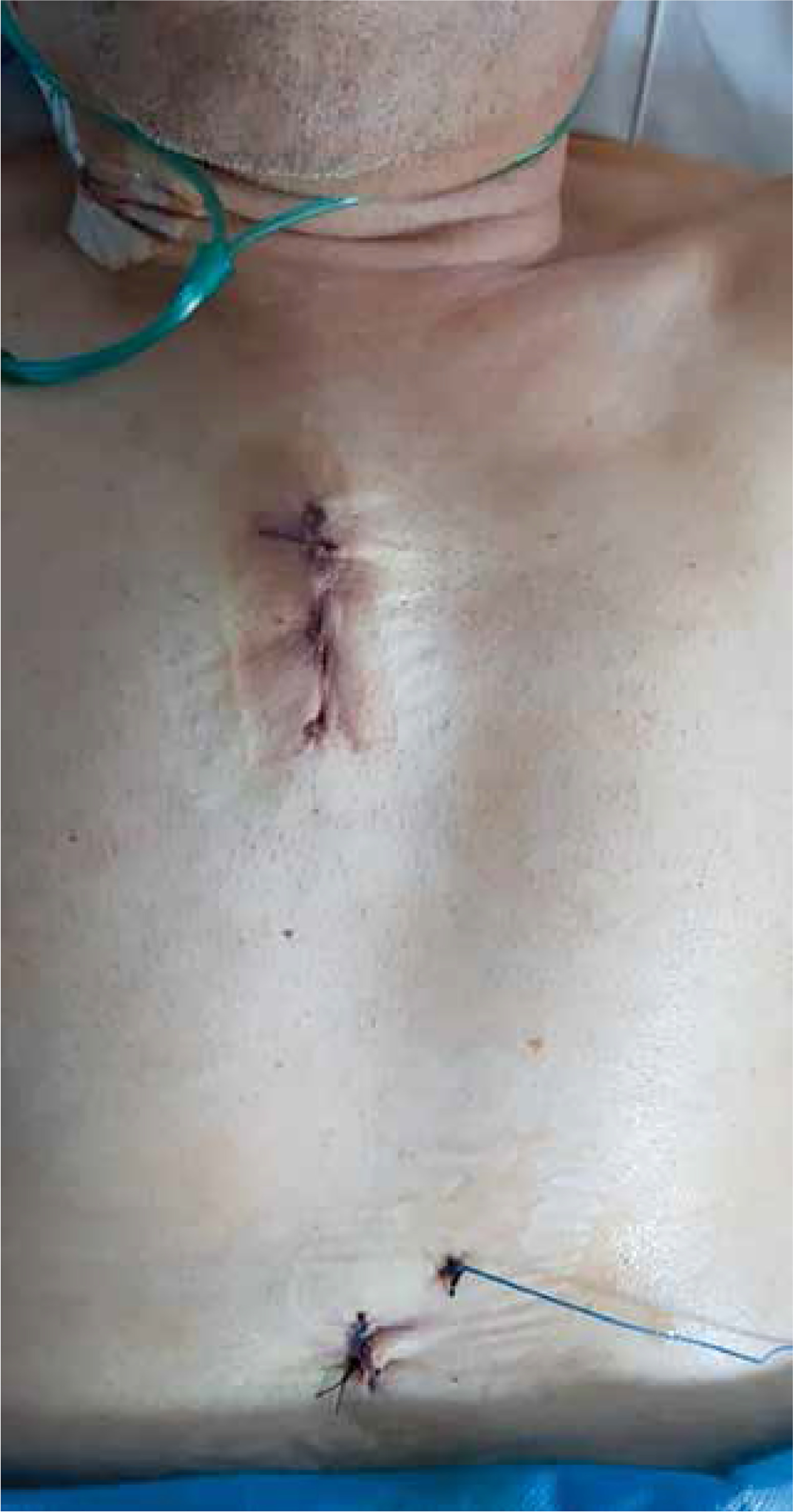 The competence of the aortic valve is checked again by transesophageal echocardiography. Careful and meticulous hemostasis is performed. BioGlue Surgical Adhesive (Jotec, Kennesaw, Georgia, United States) is used to buttress the suture lines. A bipolar electrode is placed for temporary stimulation at the anterior aspect of the RV outflow tract. The patient is weaned from extracorporeal circulation. The cannulas are removed and protamine sulfate is administered in a 1 : 1 ratio. A single 28F chest tube is inserted into the anterior mediastinum and exits under the xiphoid process. The pericardium is closed over the aorta. A gentamicin sponge is used for sternal wound infections prophylaxis. The breastbone is closed with three metal sutures. The subcutaneous tissue and the skin are closed in layers (Figures 8 and 9).