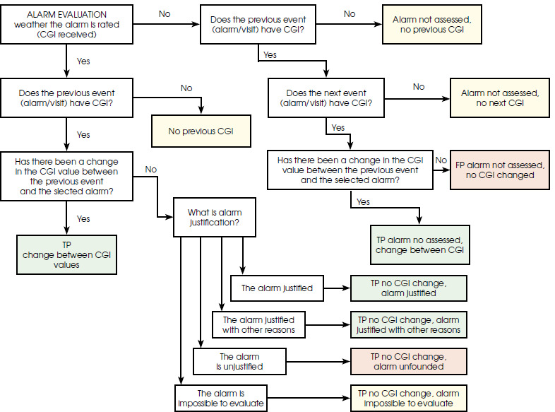 The first scheme applies specifically to the days on which an alert was sent. The initial step involves verifying the completion of the CGI scale to assess any changes in the patient’s condition compared to the previous CGI value. If the CGI scale is completed and indicates a change, the alert is labeled as TP. If there is no change in the CGI, the subjective evaluation provided by the psychiatrist for each alert is considered. Based on this evaluation, the alert may also be labeled as tp, if justified according to the psychiatrist’s subjective opinion. Additionally, it is noted that it was not possible to evaluate the alert due to the lack of contact with the patient within a reasonable timeframe since the alert was issued.