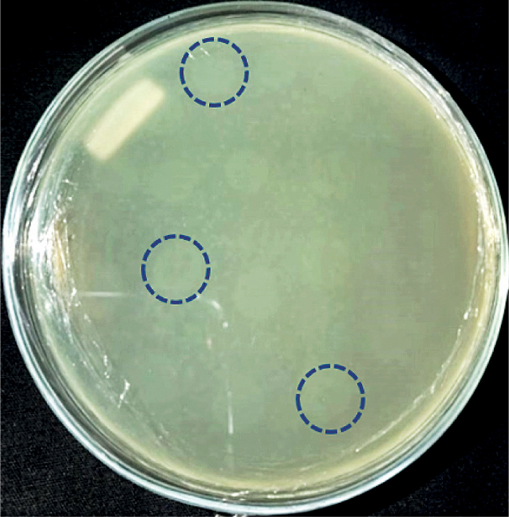 Isolation of bacteriophages with primary host bacteria of Alcaligenes showed plaque formation (Fig. 1), which indicated an infection mechanism carried out by bacteriophages against their hosts. Infection can occur because bacteriophages are able to degrade the cell wall of host bacteria through the production of the enzyme endolysin, which is encoded in the genetic material of the bacteriophage. The endolysin enzyme can hhydrolyse the peptidoglycan layer, which is followed by the occurrence of osmotic pressure disturbances in the bacterial cell wall [11, 14, 18].
