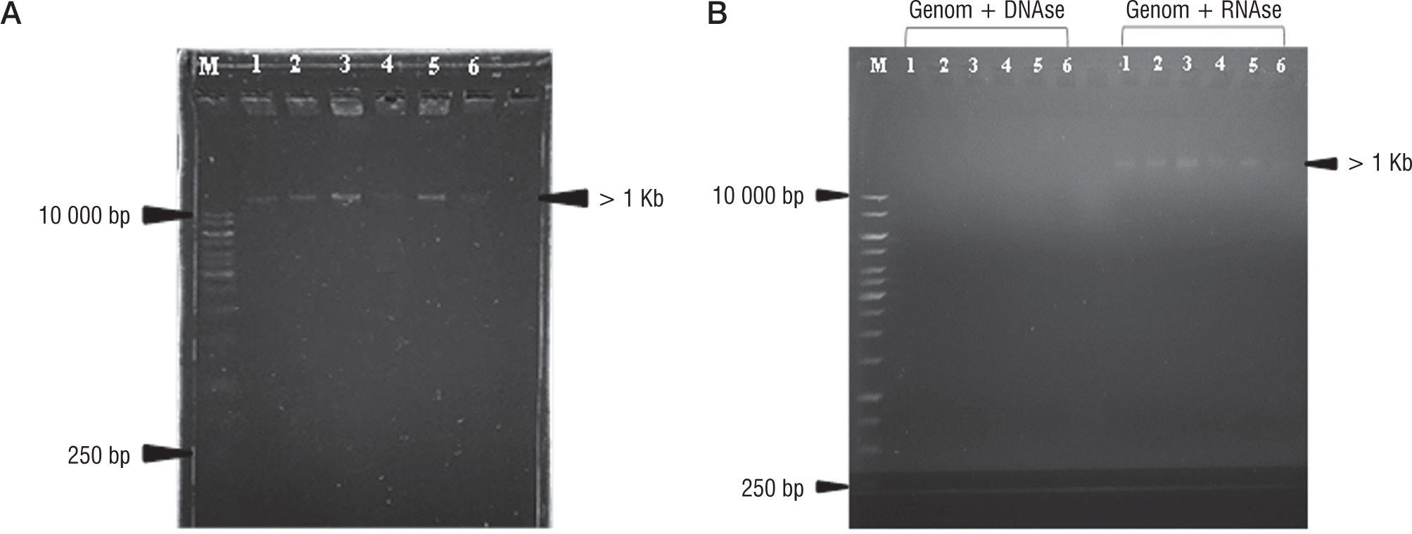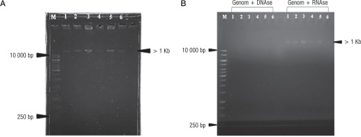 Nucleic acid extraction results of bacteriophage isolates AFaV1, AFaV2, AFaV3, AFaV4, AFaV5, and AFaV6 were visualized using a UV Transilluminator (Fig. 2). It is known that the 6 bacteriophage isolates that have been isolated have genome lengths of more than 1Kb or 10,000 base pairs. Bacteriophages generally have the nucleic acid type DNA or RNA. The nucleic acid possessed by bacteriophages can be one of the factors in the classification of bacteriophages, so it is necessary to test it in order to determine the type of nucleic acid possessed by bacteriophages that have been isolated [34]. The type of nucleic acid can be determined by treating the DNAse and RNAse enzymes to the isolated sample. DNAse enzymes are enzymes that play a role in the DNA degradation process, while RNAse enzymes play a role in RNA degradation [36]. The 6 isolated bacteriophage samples were known to have DNA nucleic acids. It can be seen from the extraction of samples that are degraded by the DNAse enzyme but not degraded by the RNAse enzyme (Fig. 2B). It is also known that bacteriophages belonging to the Siphoviridae family have DNA nucleic acids [36].