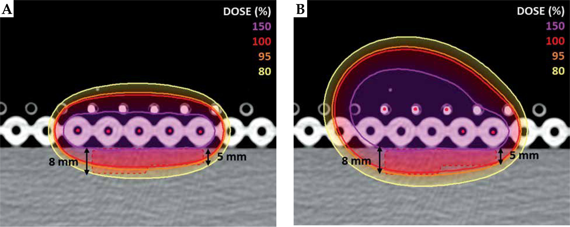 A solid water phantom was used for the purpose of this study, and a CT scan was obtained with a slice thickness of 0.625 mm on a Discovery CT590RT CT scanner (GE Medical System). OncentraBrachy treatment planning system (TPS v.4.6.2 Elekta, Sweden) was applied for organs at risk (OARs) and clinical target volume (CTV) contouring and planning. Normally, the term ‘therapeutic window’ (TW) is referred to as the separation between tumor control and adverse event in clinical setting. In skin IRT, tumor control is strictly related to the coverage with 100% isoline (dose prescription) and the maximum isoline allowed to prevent toxicity, which in several series is reported as high as 150% isoline [7, 9]. For such reason in this report, we referred to the TW as the distance between the 100% and the 150% isoline.