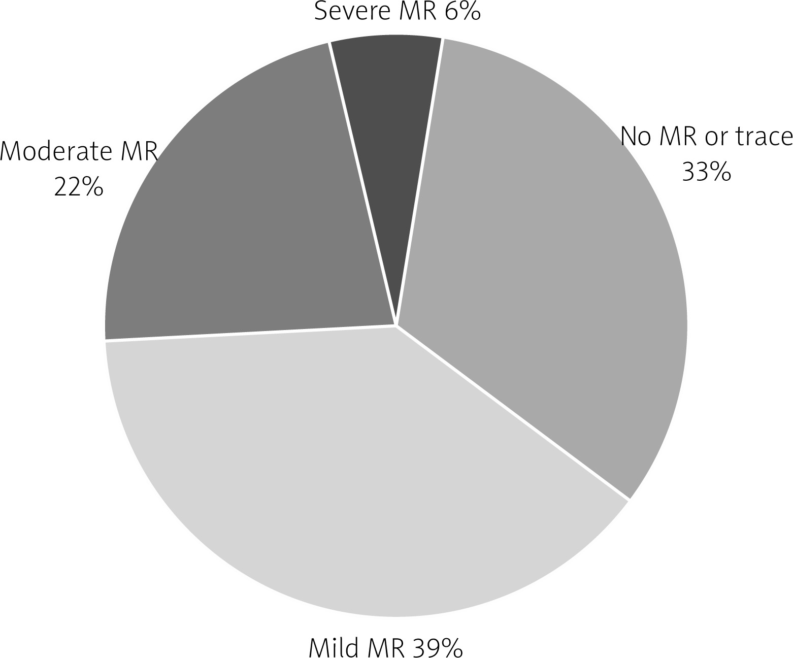 The study cohort consisted of 95 patients with a mean age of 79.1 ±5.3 years. Women accounted for 47.4% (45 patients), while men comprised 52.6% (50 patients). MR was identified in two-thirds of the study population, with moderate to severe MR present in 28% of patients (Figure 2).