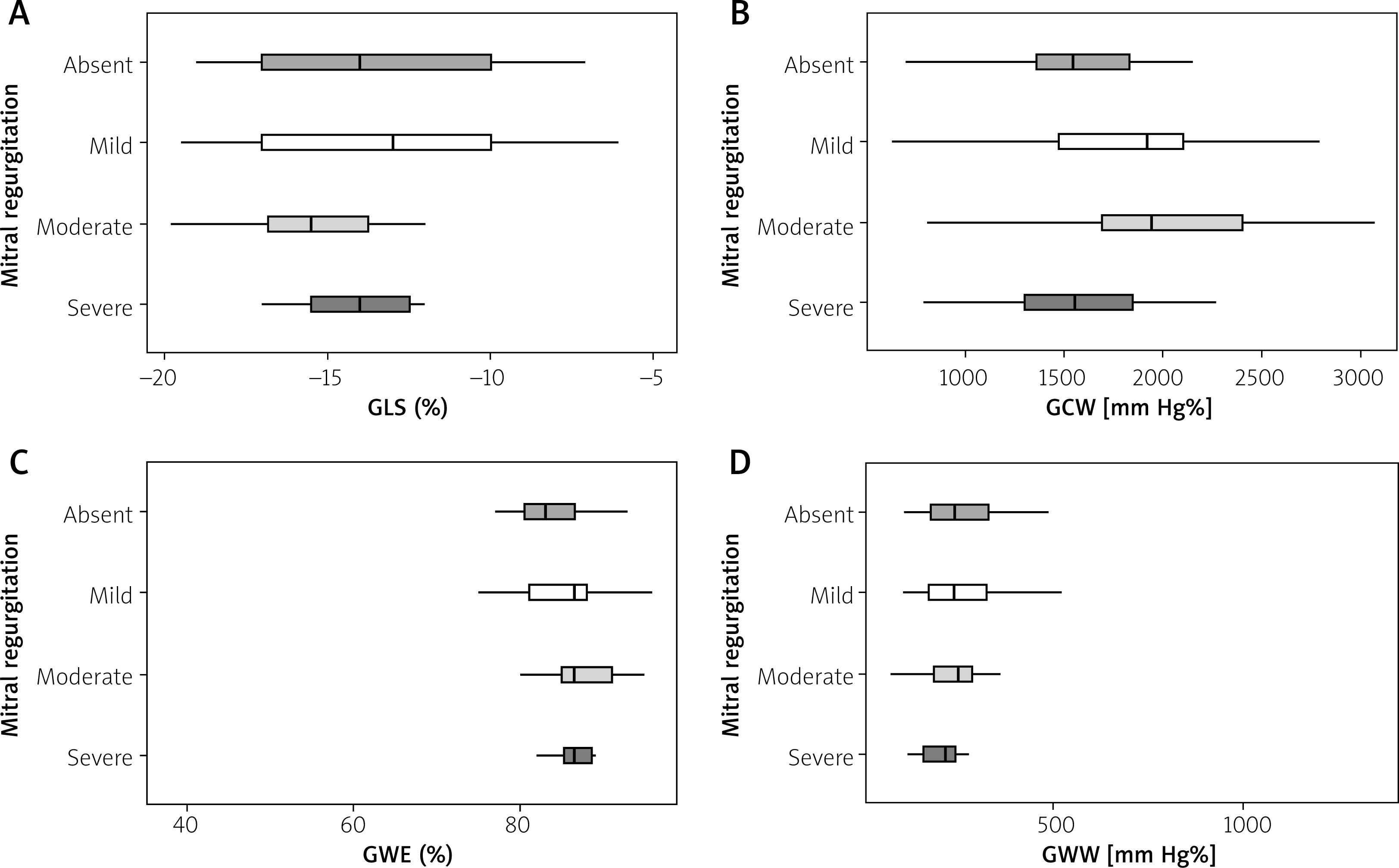 In summary, the findings indicate that while parameters such as GLS and GWW remain comparable across patient groups with varying degrees of MR, GCW and GWE may serve as a more sensitive indicator of changes in cardiac function in relation to MR severity.