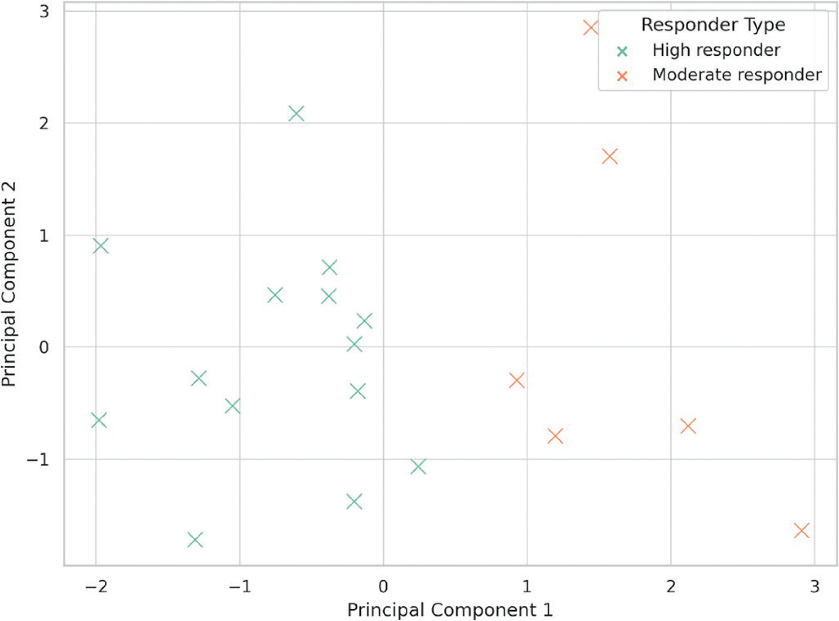 Principal component analysis (PCA) and K-means clustering based on sprint variables. PC1 represents the reactive strength index (RSI), ground contact time (GCT), and flight time (FT); PC2 represents interlimb asymmetry, mediolateral sway, and step frequency. Clustering distinguishing athletes into distinct responder profiles.