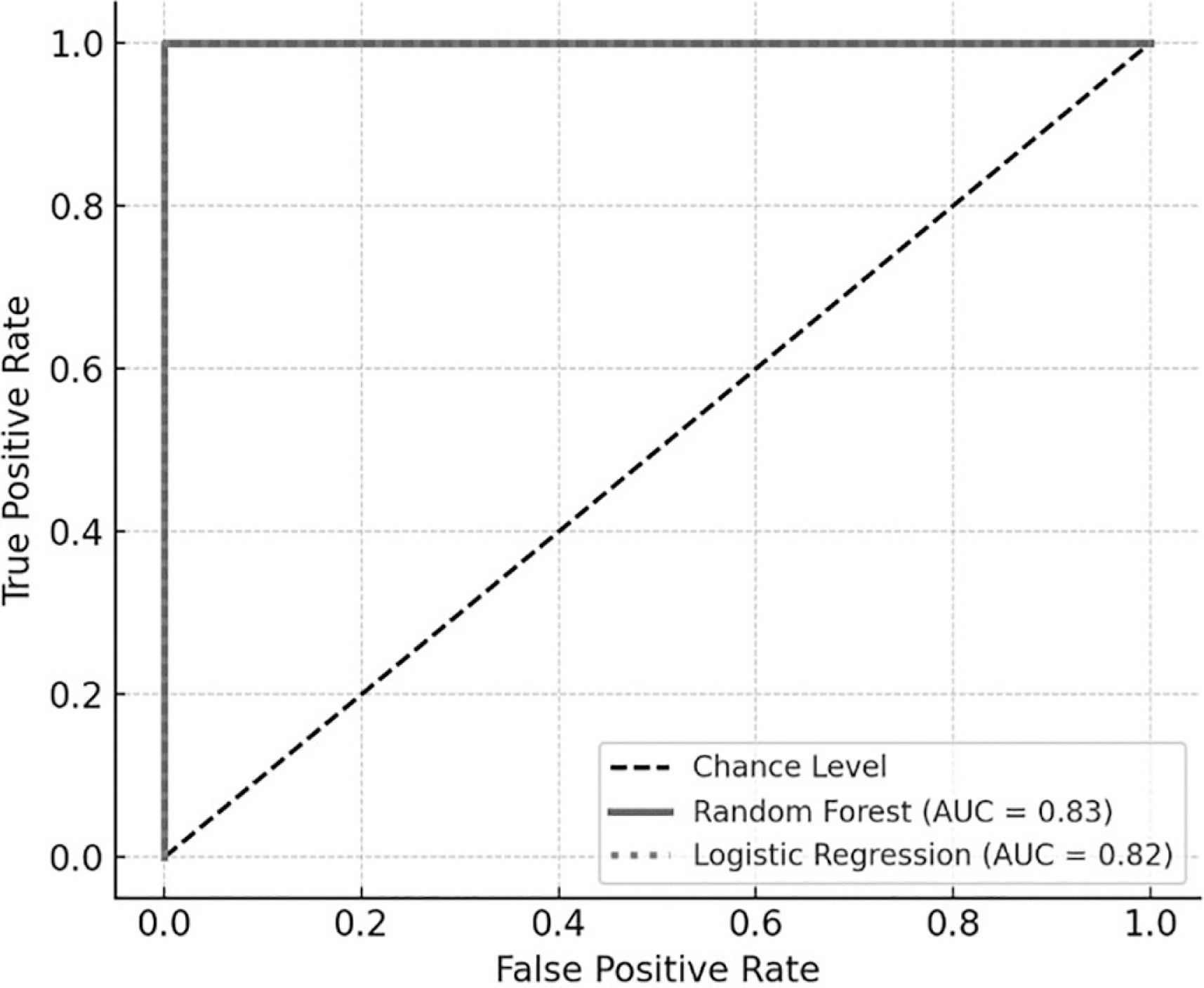 ROC analysis confirmed the strong classification performance of both predictive models. As shown in Figure 4, the AUC for the Random Forest model was 0.85, while logistic regression achieved an AUC of 0.82, indicating good-to-excellent model discrimination across all thresholds. These models consistently distinguished between responders and non-responders to priming on the basis of their biomechanical profiles