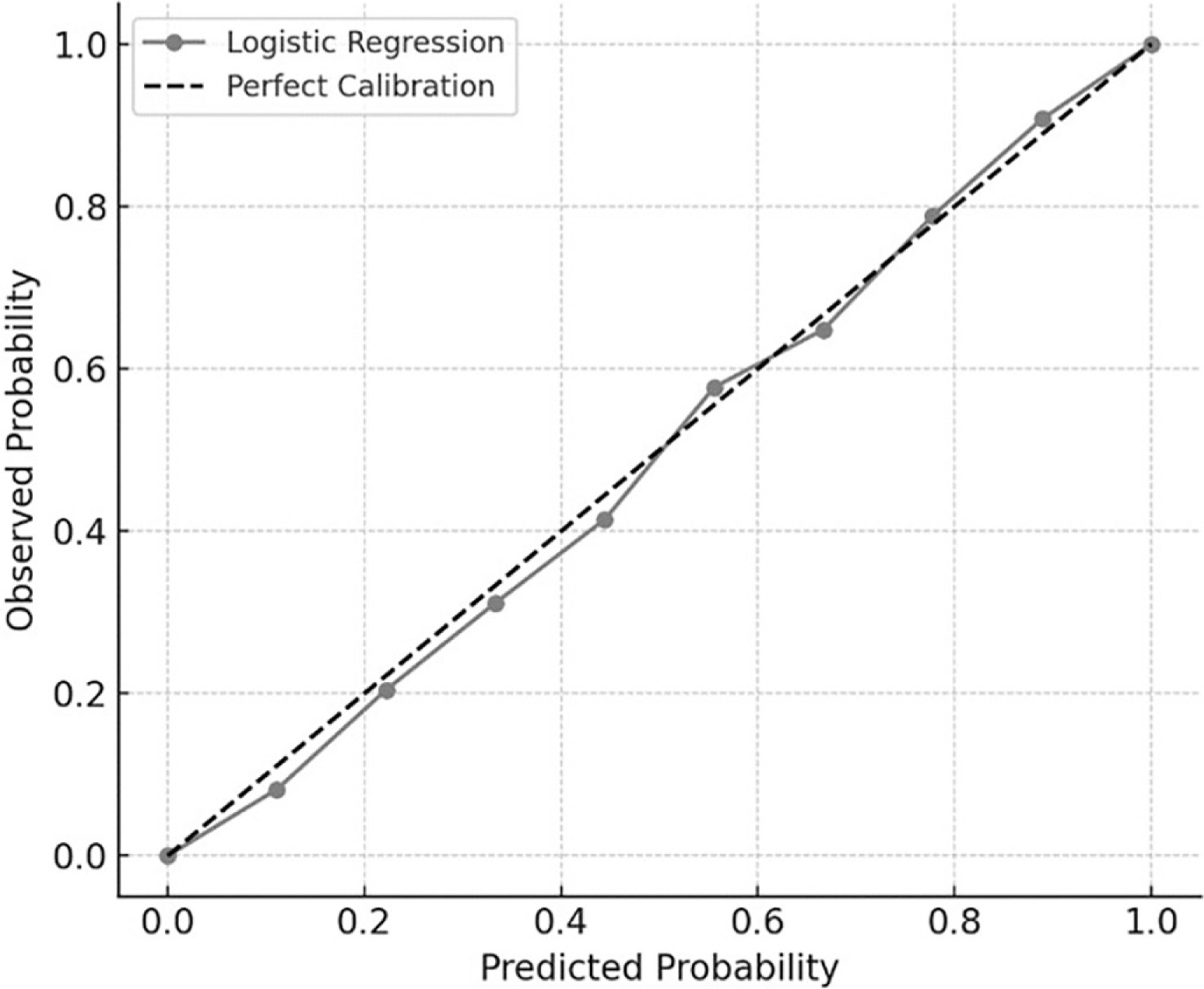 To assess the reliability of the probabilistic predictions from the logistic regression model, a calibration curve was generated. As illustrated in Figure 5, predicted probabilities aligned closely with observed outcomes, with all deciles falling near the reference line. This indicates that the logistic model not only classified outcomes effectively but also produced well-calibrated probability estimates, thereby supporting its practical utility for individual-level performance forecasting.