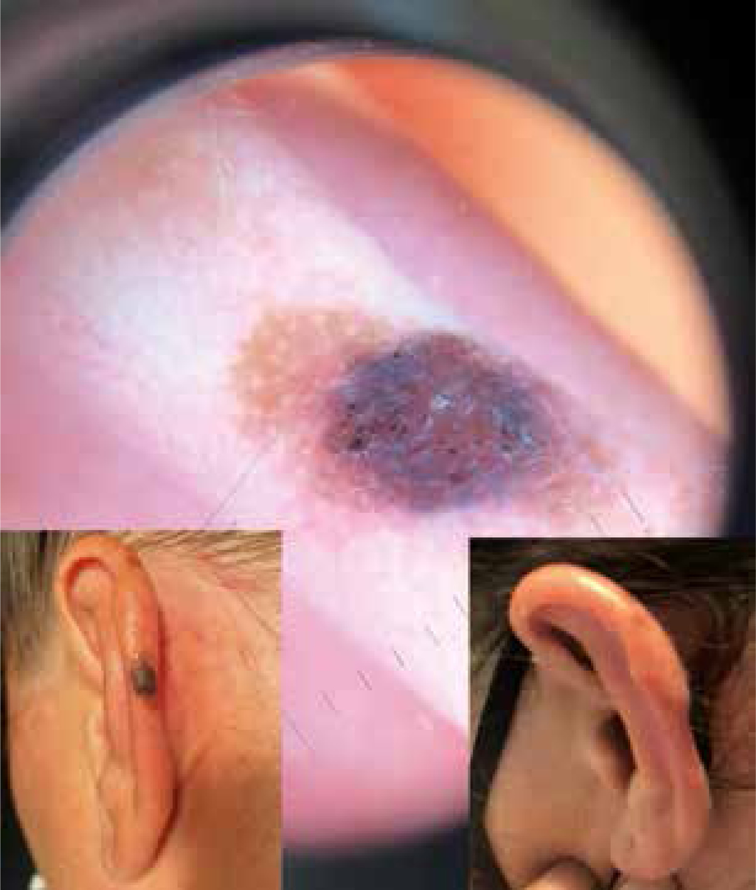 External ear melanoma (EEM) is a rare type of melanoma (approximately 1% of all cutaneous melanomas) [1] with higher likelihood of an invasive nature compared to other head and neck melanomas [2]. According to previous data, superficially spreading melanoma is the dominant subtype of the EEM, followed by lentigo maligna and nodular subtype, respectively [1, 3, 4]. Patel et al. [5] discovered that EEM prevalence among young adults is currently higher by 111.9% when compared to former data. Herein, we report a nodular melanoma of the external ear in a middle-aged female, which was successfully removed with simple surgical procedure.
