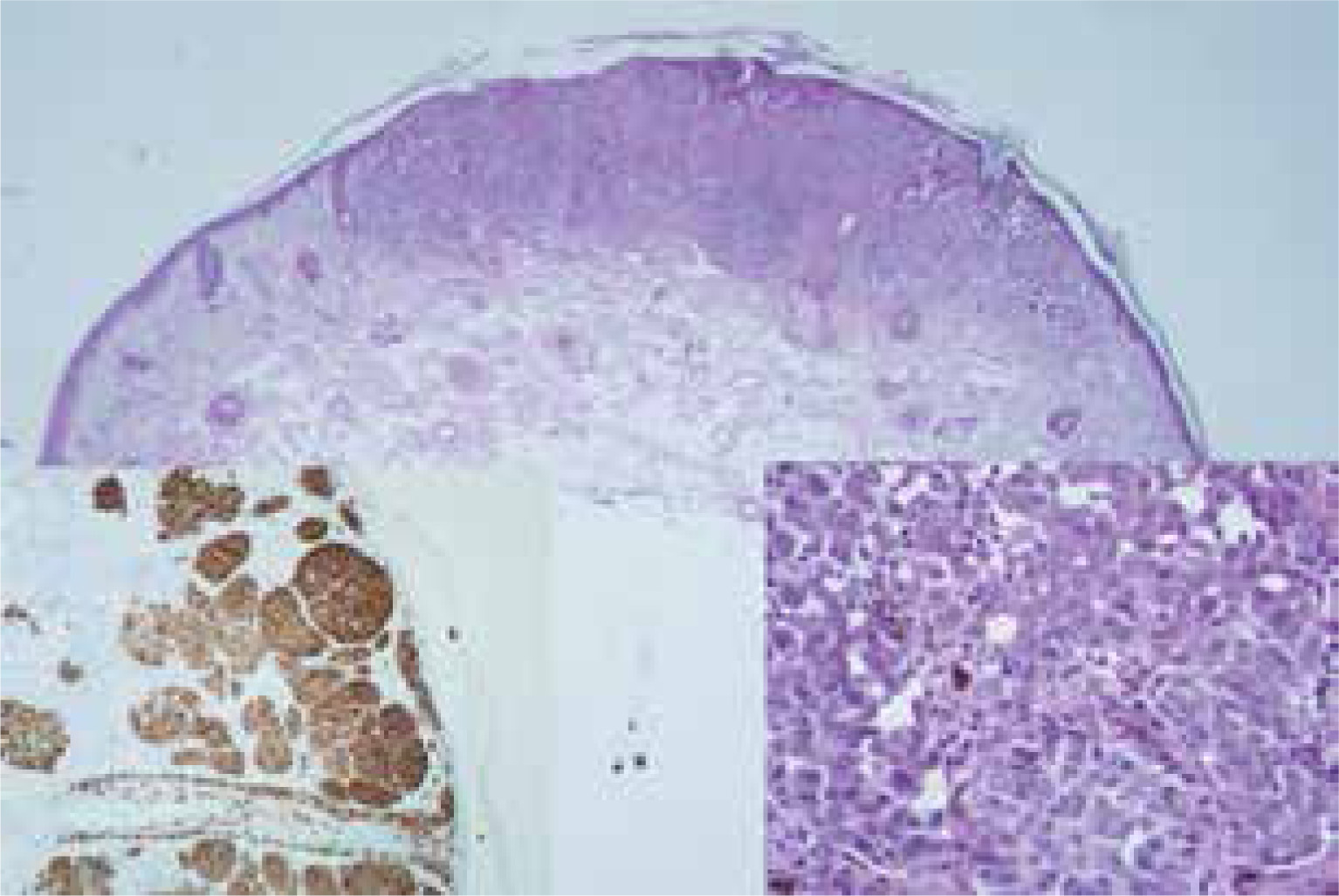 A 43-year-old female patient was admitted to the outpatient clinic with pigmented nevus on the left helical rim (Figure 1). The lesion was noticed by a family member about a month before. The woman’s family medical history was free of melanomas or other skin neoplasms. According to Fitzpatrick classification, the patient had phototype no. 2, and in the past she had experienced numerous sunburns. During consultation a 5 × 6 mm nodular skin lesion placed in the middle of a 10 × 6 mm pigmented mark was revealed in a dermatoscopy, with multiple signs suggesting its malignant character, such as asymmetry, irregular border, multiple range of colours from plain on the outside to the redness on the inside, dark-brownish colour on the lump, and a milky-pink background (Figure 1). The dermoscopic examination revealed a multi-element pattern, blue-whitish blur, small black bodies at the border, and peppering. There was no ulceration or satellite metastasis seen near the main lesion. Regional lymph nodes were not enlarged in physical examination. According to the recommendations of the Polish Society of Oncologic Surgery, the excisional biopsy was performed with 2 mm margins as a first step of treatment [6]. The elliptical wound was closed with 5.0 nonabsorbable sutures. The histological picture (Figure 2) presented with 1 mm depth infiltration of malignant cells in the Breslow scale. Other histological features were Clark level no. 3, no ulceration, brisk type of lymphocytic infiltration, mitotic activity 1 mitosis/mm2. Moreover, an immunohistochemical investigation was done, in which Melan A (+), HMB 45 (+), S100 (+), and Ki67 (15% expression) in hot spots were found. The margins of the resected lesion were free from melanoma cells (from 1.2 to 3 mm). The clinical diagnosis of nodular melanoma of the external ear was confirmed, and the patient was referred to the oncology ward to undergo sentinel node identification process and subsequently biopsy or dissection. Unfortunately, she was lost to follow-up.