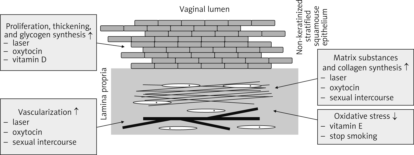 Vitamin D has also been evaluated in the female reproductive physiology. Vitamin D receptor was identified in the female reproductive organs, and the structure of vitamin D is analogous to the structure of progesterone as fat-soluble secosteroid hormone [44]. In addition, vitamin D regulates the proliferation and promotes the differentiation of keratinocytes, such as those of the vaginal stratified squamous epithelium [45]. On that basis, it was proposed that vitamin D supplementation may promote vaginal epithelial maturation [46]. Available evidence from non-randomized clinical studies provides conflicting data regarding symptom improvement following vitamin D supplementation. There is limited support for the use of vitamin D for the treatment of urogenital aging, requiring further investigation, although an improved effect on epithelial cells was reported [46–49]. Similarly, limited non-randomized evidence supports the utility of vitamin E application as vaginal capsules to improve lubrication and urogenital aging symptoms. Anti-inflammatory and antioxidant functions of vitamin E might prevent damage by oxidative agents (Fig. 1) [23, 49, 50].