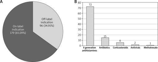 Out of 275 prescriptions for systemic medications, the biggest group were antihistamines (120 first-generation and 72 second-generation ones), then antibiotics (32), probiotics (23), corticosteroids (14), antivirals (7) cyclosporine (6) and methotrexate (1). Ninety six medications (34.53%) were prescribed off-label in relation to the indication, with second-generation antihistamines being the most frequent ones (72), followed by antibiotics (15), corticosteroids (6), antivirals (2) and methotrexate (1). Second-generation H1 receptor antagonists prescribed off-label were bilastine (28), cetirizine (28), levocetirizine (9), fexofenadine (3) rupatadine (3) and desloratadine (3).
