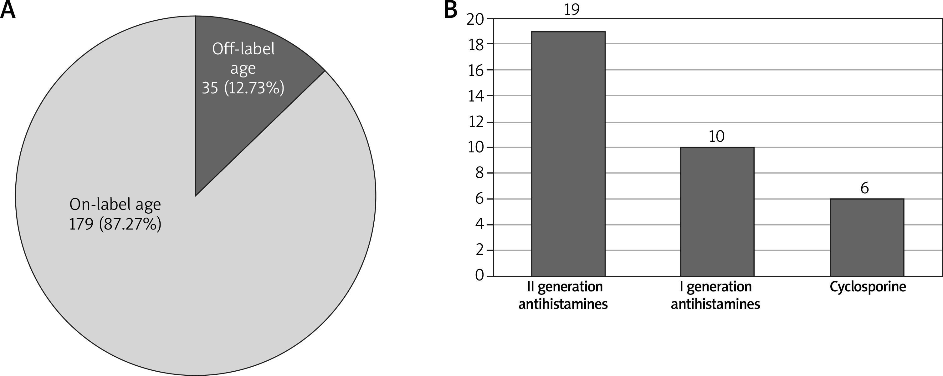 Off-label usage of medications due to the patient age took place in 35 cases (12.73%), including second-generation antihistamines (19), first-generation antihistamines (10) and cyclosporine (6).