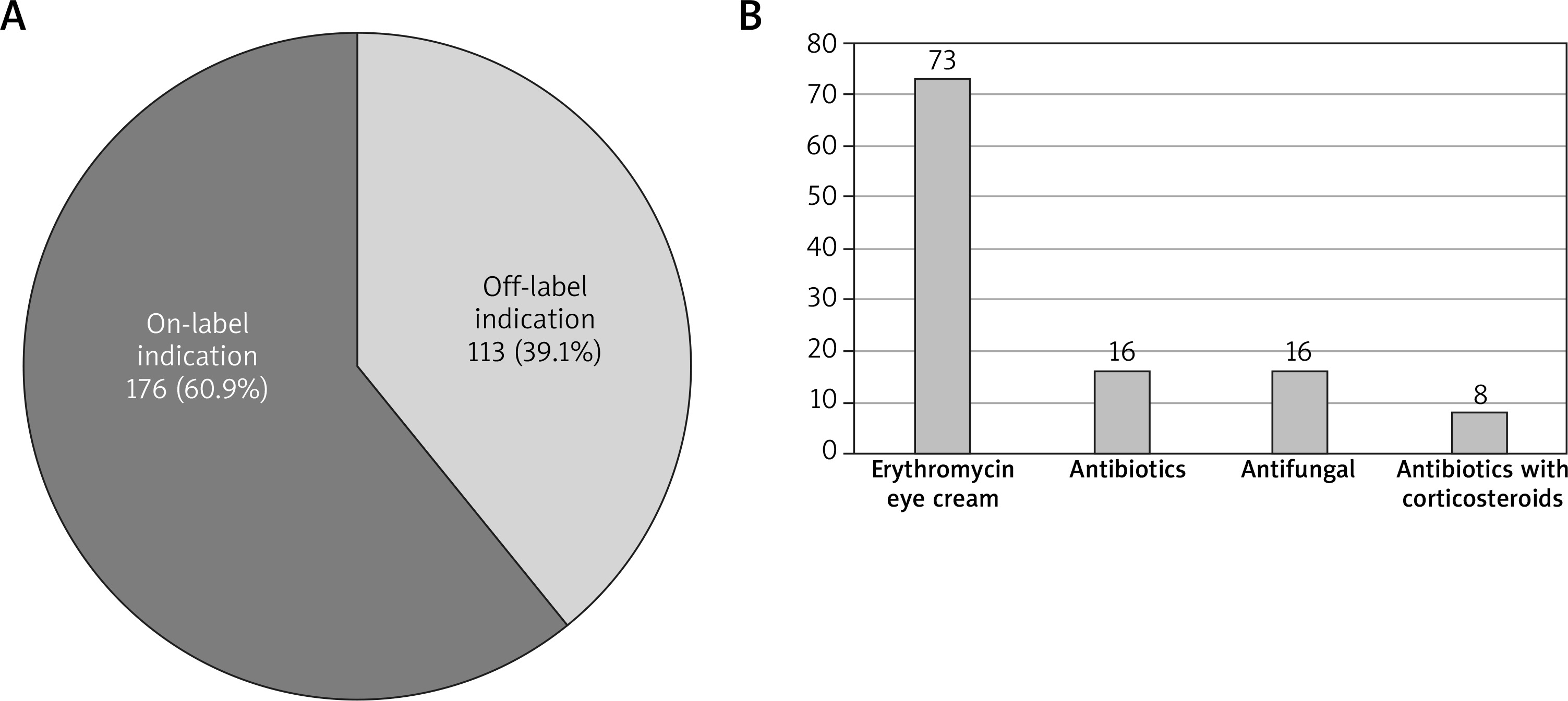 A – Systemic medications prescribed off-label versus on-label due to the indication. B – Most frequent systemic medications prescribed off-label due to the indication