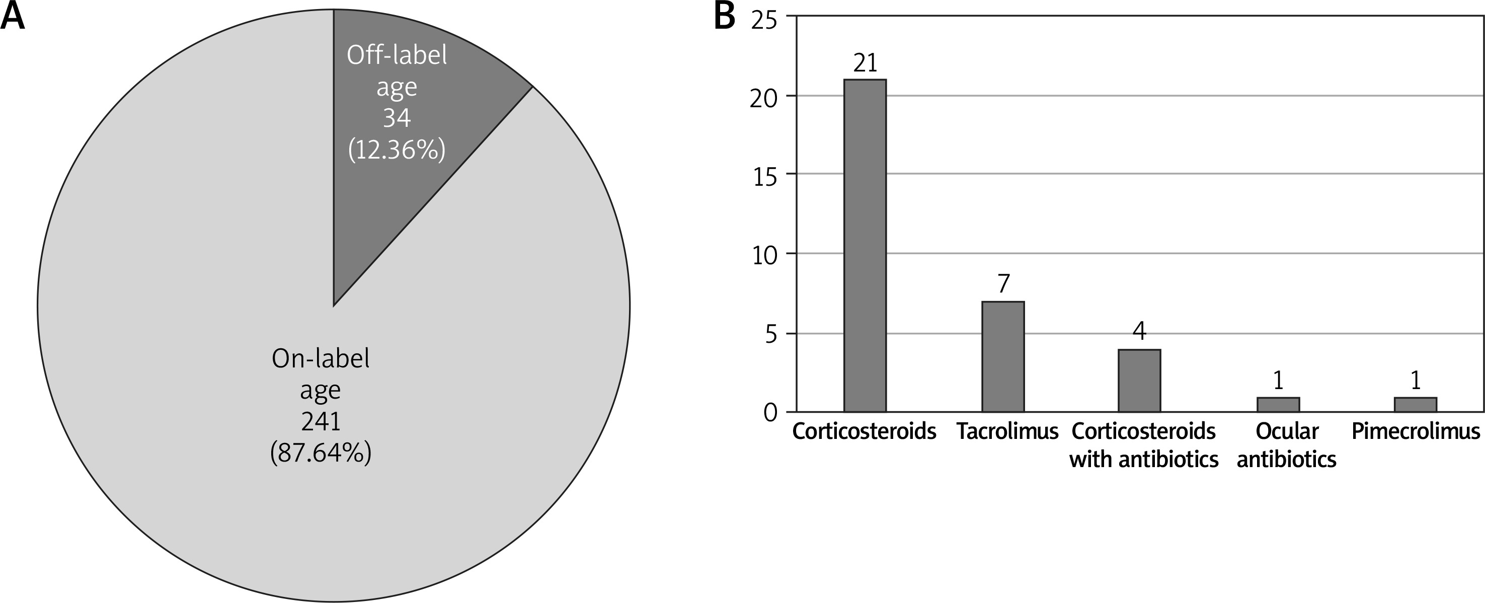 A – Systemic medications prescribed off-label versus on-label due to the age of patients. B – Most frequent medications prescribed off-label due to the age of patients