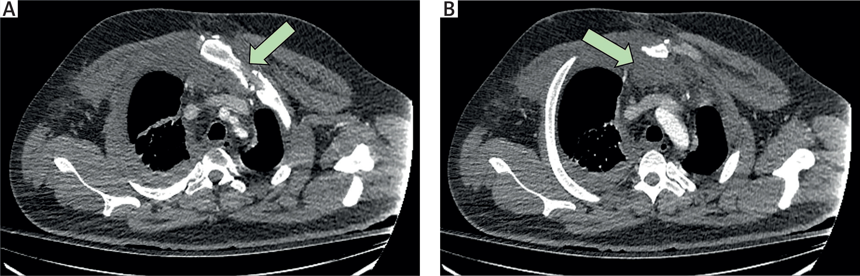 Preoperative computed tomography (CT) images demonstrating: A – displaced manubriosternal dislocation, B – associated retrosternal haematoma
