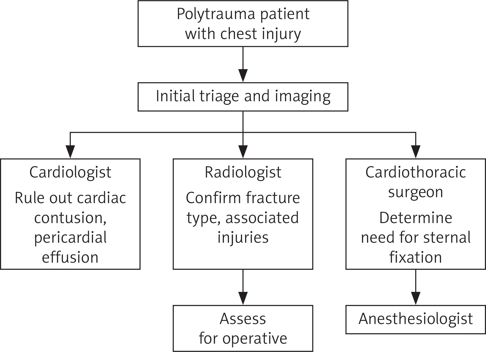 Multidisciplinary evaluation flowchart for polytrauma patients with chest injury. The algorithm outlines the stepwise approach from initial triage and imaging to specialist involvement. Key contributions include cardiology (exclusion of cardiac contusion and pericardial effusion), radiology (confirmation of fracture type and associated injuries), cardiothoracic surgery (assessment for fixation), and anaesthesiology (perioperative planning)