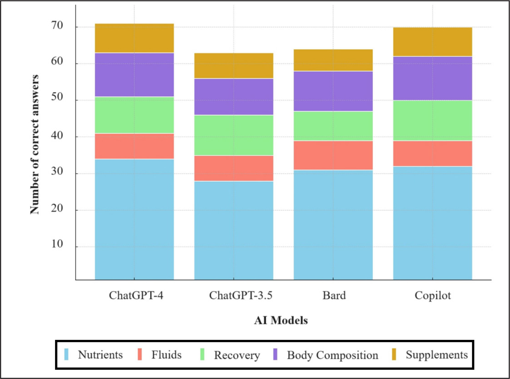 We hypothesized that the AI models, particularly the more advanced versions like ChatGPT-4, would provide nutrition advice comparable to or even superior to that provided by sports nutritionists and dietitians, especially in terms of accuracy and consistency. Also, we expected significant differences in performance among the AI models, with ChatGPT-4 predicted to outperform ChatGPT-3.5, Google Bard, and Microsoft Copilot due to its more sophisticated algorithms and larger training dataset.