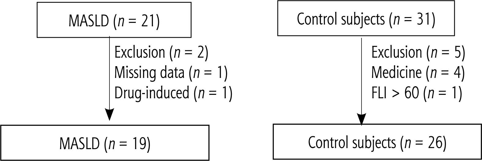 Twenty-one patients with MASLD and 31 CSs participated in the present study. Two patients with MASLD and 5 CSs were excluded based on the entry criteria (Fig. 1). Ultimately, 19 patients with MASLD and 26 CSs were analyzed. The characteristics of participants are shown in Table 1. There was no significant difference in age between the two groups. Patients with MASLD were characterized by a high body mass index, high frequency of dyslipidemia, and elevated transaminase levels. No significant difference in fibrosis-4 (FIB-4) index was observed between CS and MASLD groups. Additionally, the mean level of M2BPGi, a marker for liver fibrosis, was 0.72 (±0.21) in patients with MASLD. The maxima of the FIB-4 index and M2BPGi in the MASLD group were 1.9 and 1.24, respectively. Thus, the MASLD group did not include patients with advanced fibrosis.