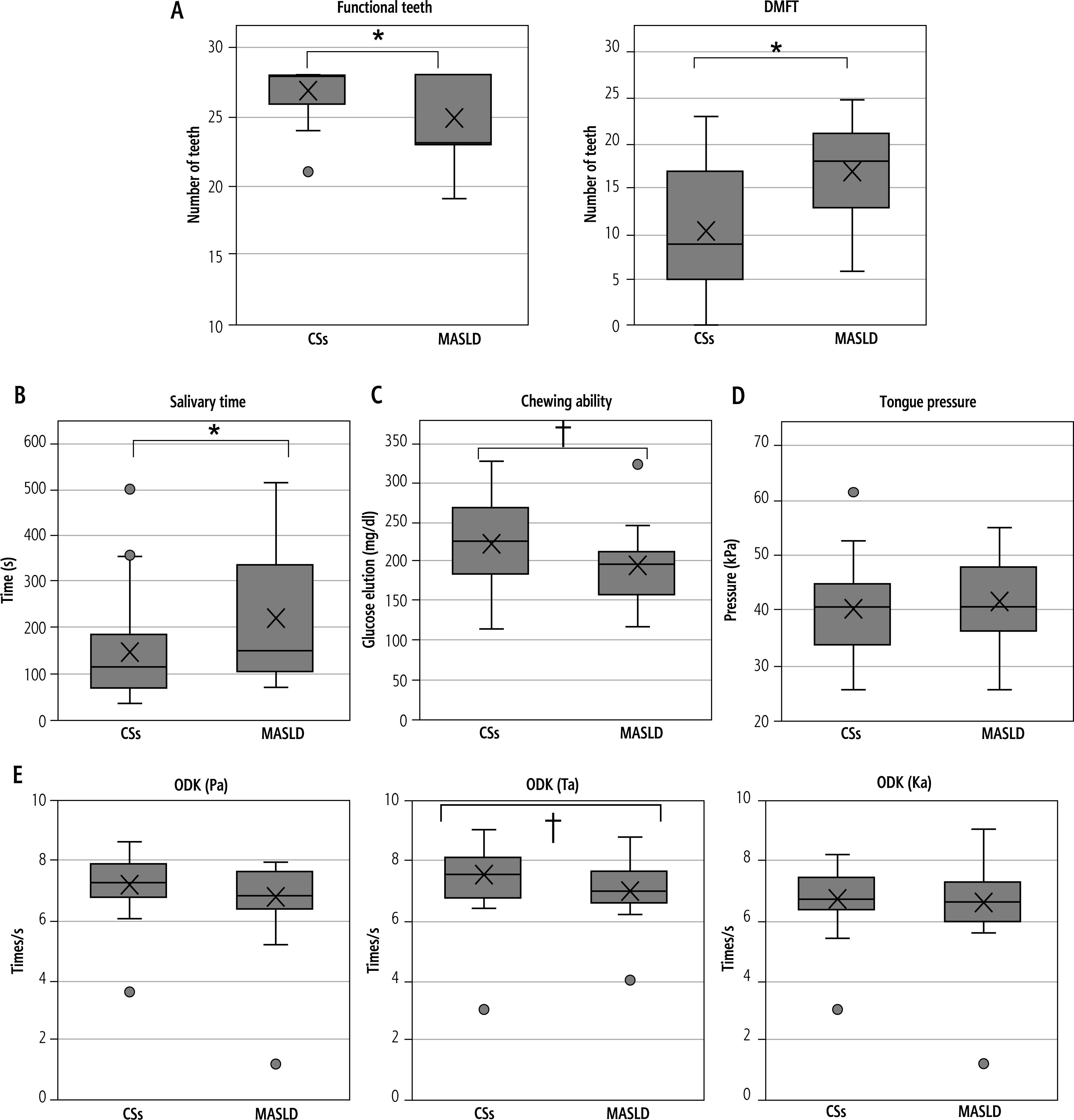 Assessment of oral function. A) Number of functional teeth and decayed, missing, and filled teeth (DMFT). B) Salivary time. C) Chewing ability. Glucose elution < 100 mg/dl is considered as low chewing ability. D) Tongue pressure. Pressure < 30 kPa is considered as low tongue pressure; E) ODK (Pa), ODK (Ta), and ODK (Ka). Less than 6 times/s is considered as low ODK