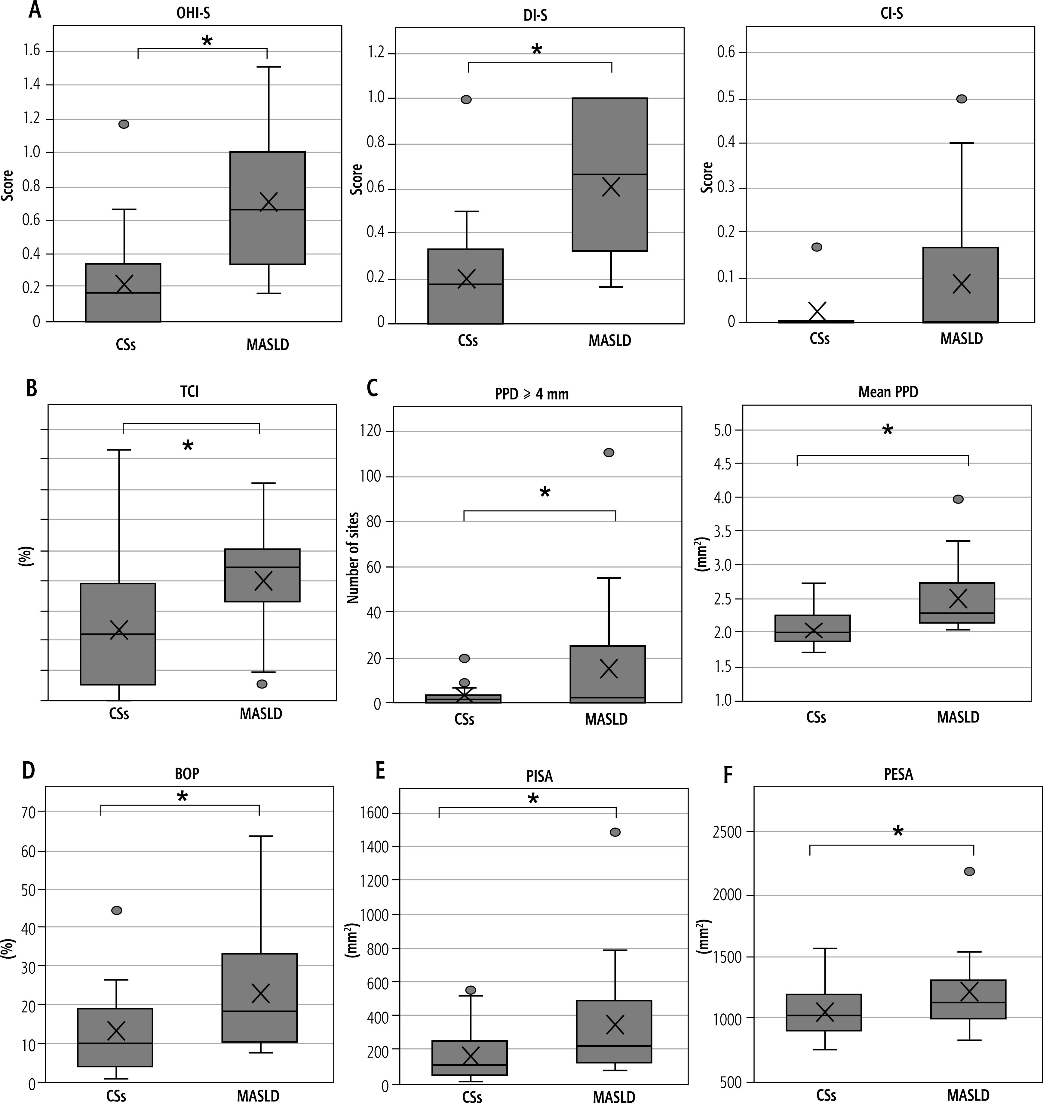 Assessment of oral hygiene and periodontal conditions. A) OHI-S, DI-S, and CI-S; B) TCI; C) Number of sites with PPD ≥ 4 mm and mean PPD; D) BOP (%); E) PISA; F) PESA
