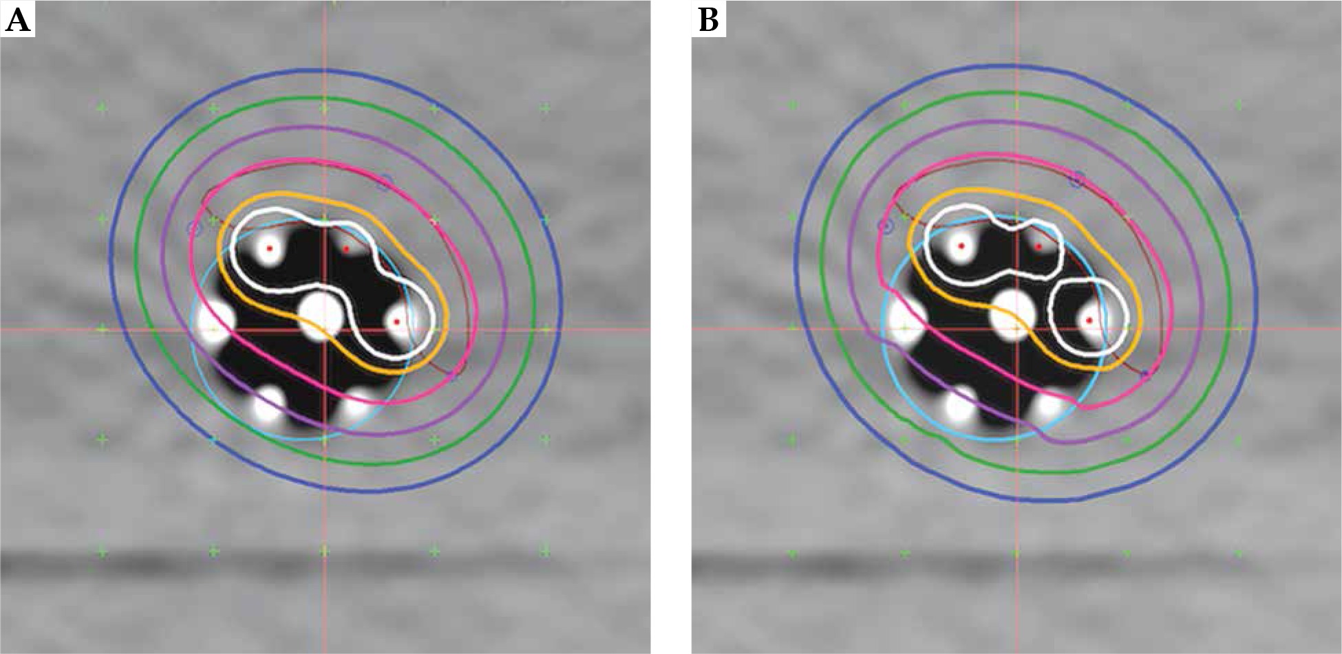Figure 3 shows the cross-sectional dose distributions for a target ring of 5 mm thickness, using one central channel (A) or 6 peripheral channels (B). The dose was normalized to 5 mm depth from the applicator surface; source dwell points were separated by 5 mm in each channel, using optimization on dose points. Figure 5 is an example of using all 6 channels for a target having 2 thicknesses. Graphical optimization was applied to conform the 100% isodose line to the target depths. If a single central catheter was used, the dose distribution was as shown in Figure 3A for any of the cases discussed. The volume data provided in Table 1 were taken from dose-volume histogram (DVH) analysis from Oncentra software. The non-target V100 was the volume of 5 mm ring enclosed by the 100% isodose that was not a part of the target. It was obtained by subtraction of V100 values from the ring volume (16.6 cc). These data were used to calculate a conformity index (CI = TV/PTV; ICRU 62), for which the treatment volume (TV) was the volume of tissue re-ceiving 100% dose (it obviously excludes the applicator) and the contoured target was taken as the planning target volume (PTV).