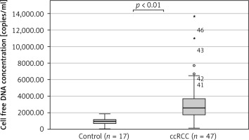 Comparison of cell free DNA concentration between control group (n = 17) and clear cell renal cell carcinoma patients (n = 47)