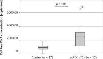 Comparison of cell free DNA concentration between the control group (n = 17) and patients with clear cell renal cell carcinoma clinical stage 1 (n = 17)