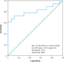 Moreover, we found that the median cfDNA plasma concentration was significantly higher even in patients with low clinical stage ccRCC cT1a (n = 17) compared to the control group (n = 17), (2473 ±1584 copies/ml vs. 960 ±490 copies/ml, p < 0.01 Mann-Whitney U test) (Fig. 2). The circulating free DNA concentration (cut-off value: 1433 copies/ml) was able to distinguish between control group (n = 17) and low clinical stage (cT1a) ccRCC (n = 17) with an estimated AUC of 0.796 (95% CI: 0.634–0.958) (Fig. 3).