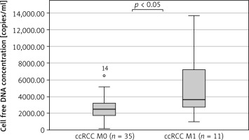 Comparison of cell free DNA concentration between nonmetastatic clear cell renal cell carcinoma patients (ccRCC M0, n = 35) and metastatic clear cell renal cell carcinoma patients (ccRCC M1, n = 11)