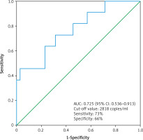 The median cfDNA concentration was significantly higher in metastatic ccRCC patients (n = 11) compared to non-metastatic ccRCC patients (n =35) (3619 ±4059 copies/ml vs. 2473 ±1378 copies/ml, p = 0.03, Mann-Whitney U test) (Fig. 4). The circulating free DNA concentration (cut-off value: 2818 copies/ml) was able to distinguish non-metastatic ccRCC patients (n = 35) from metastatic ccRCC patients (n = 11) with an estimated AUC of 0.725 (95% CI: 0.536–0.913) (Fig. 5).