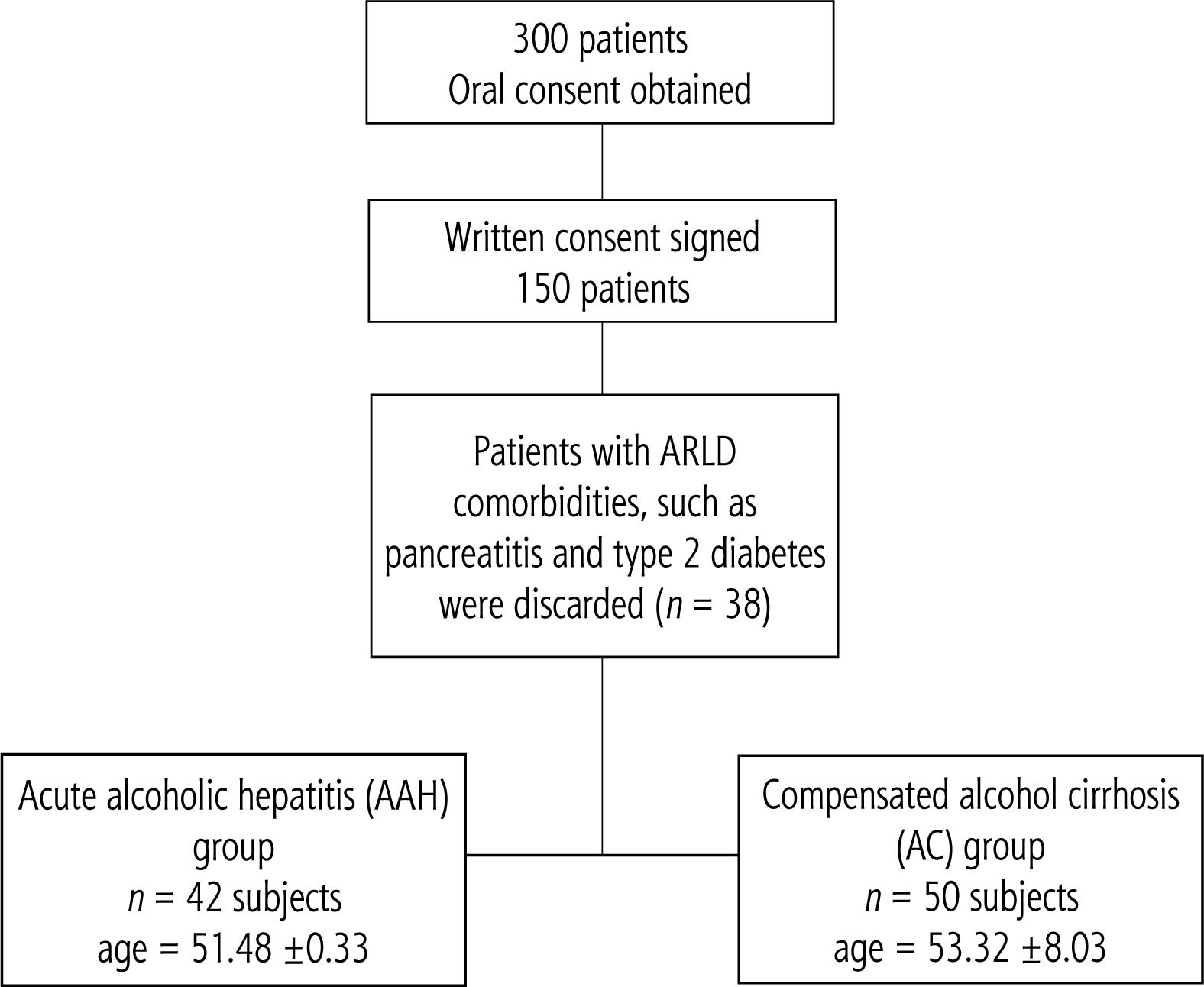 The data used in this study included blood tests of male patients admitted to Bródnowski Hospital in Warsaw, Poland, between March and May 2022. Furthermore, the personal records of the male patients are archived in the hospital. The acute alcoholic hepatitis (AAH) group consisted of N = 42 subjects (age = 51.48 ±10.33 years), and the compensated alcohol cirrhosis group (AC) consisted of N = 50 subjects (age = 53.32 ±8.03 years). For all the subjects, the mean body mass index (BMI) was 20, with a standard deviation of 1.23. For all the subjects, it was the first incidence of medical diagnosis of ARLD. The diagnosis was made by combining laboratory tests, i.e., analysis of levels of the liver enzymes AST and ALT, their ratio, and levels of γ-glutamyl transferase (GGT). Laboratory tests were supported by liver biopsy and ultrasound (US) or CT/MRI scans. Patients with ARLD comorbidities, such as pancreatitis and type 2 diabetes, were excluded from the study. The flow chart of sample selection is shown in Figure 1. An outline of the patients’ treatment course is shown in Table 1.