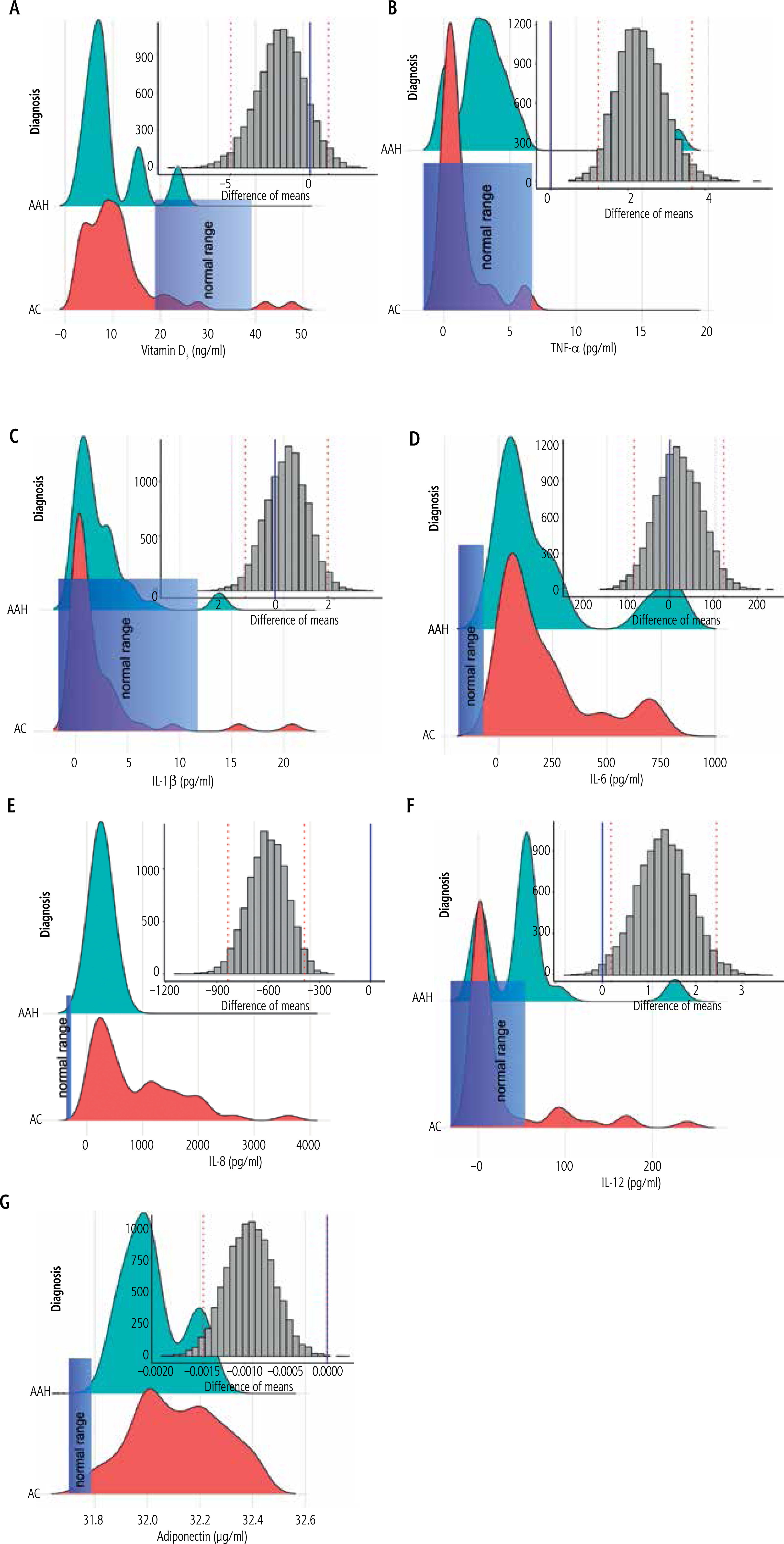 Density plots of studied parameters: A) Density plots of distributions of vitamin D3 levels stratified by alcohol-related liver disease: compensated alcohol cirrhosis (AC) and acute alcohol hepatitis (AAH). Inset: bootstrapped difference in means between the sample. Red dotted lines – 95% confidence interval, blue dotted line – zero. Statistically significant difference corresponds to zero beyond the area encompassed by red dotted lines. Normal range is given after [34]. B) Density plots of distributions of TNF-α levels stratified by alcohol-related liver disease: compensated AC and AAH. Inset: bootstrapped difference in means between the sample. Red dotted lines – 95% confidence interval, blue dotted line – zero. Statistically significant difference corresponds to zero beyond the area encompassed by red dotted lines. Normal range is given after [32]. C) Density plots of distributions of IL-1β levels stratified by alcohol-related liver disease: compensated AC and AAH. Inset: bootstrapped difference in means between the sample. Red dotted lines – 95% confidence interval, blue dotted line – zero. Statistically significant difference corresponds to zero beyond the area encompassed by red dotted lines. Normal range is given after [35]. D) Density plots of distributions of IL-6 levels stratified by alcohol-related liver disease: compensated AC and AAH. Inset: bootstrapped difference in means between the sample. Red dotted lines – 95% confidence interval, blue dotted line – zero. Statistically significant difference corresponds to zero beyond the area encompassed by red dotted lines. Normal range is given after [36]. E) Density plots of distributions of IL-8 levels stratified by alcohol-related liver disease: compensated AC and AAH. Inset: bootstrapped difference in means between the sample. Red dotted lines – 95% confidence interval, blue dotted line – zero. Statistically significant difference corresponds to zero beyond the area encompassed by red dotted lines. Normal range is given after [33]. F) Density plots of distributions of IL-12 levels stratified by alcohol-related liver disease: compensated AC and AAH. Inset: bootstrapped difference in means between the sample. Red dotted lines – 95% confidence interval, blue dotted line – zero. Statistically significant difference corresponds to zero beyond the area encompassed by red dotted lines. Normal range is given after [37]. G) Density plots of distributions of adiponectin levels stratified by alcohol-related liver disease: compensated AC and AAH. Inset: bootstrapped difference in means between the sample. Red dotted lines – 95% confidence interval, blue dotted line – zero. Statistically significant difference corresponds to zero beyond the area encompassed by red dotted lines. Normal range is given after [38]