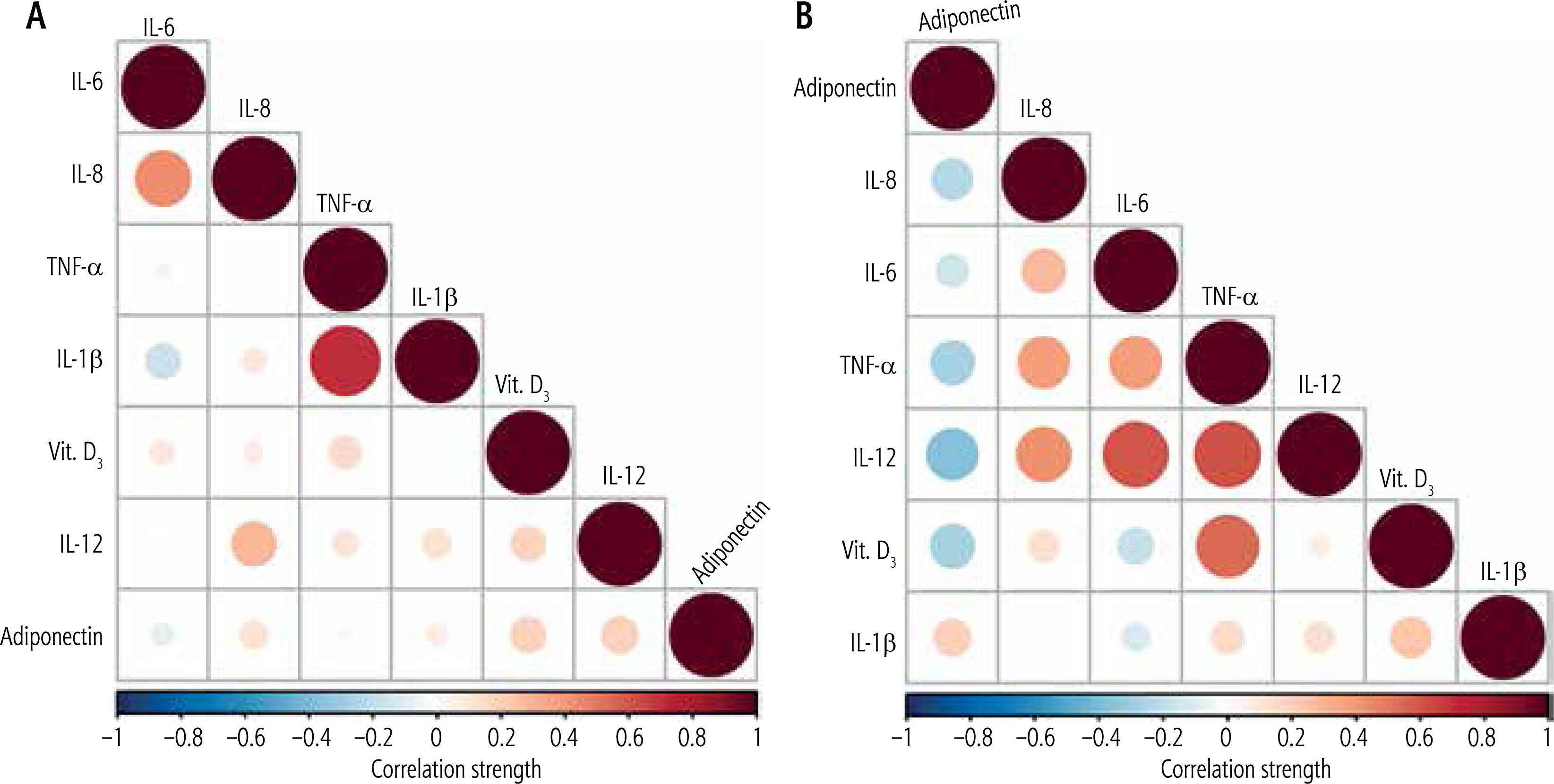 A) A matrix of correlations between the studied parameters: vitamin D3, TNF-α, IL-1β, IL-6, IL-8, IL-12, and adiponectin at p < 0.05 observed in male patients with acute alcohol hepatitis (AAH). B) A matrix of correlations between the studied parameters: vitamin D3, TNF-α, IL-1β, IL-6, IL-8, IL-12, and adiponectin at p < 0.05 observed in male patients with compensated alcohol cirrhosis (AC)