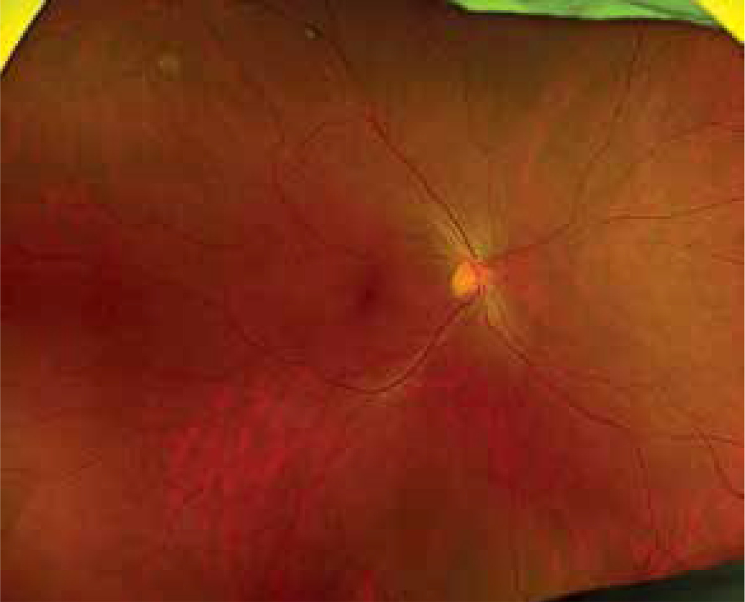Anterior segment assessment of the right eye demonstrated a nasal pterygium not extending into the visual axis (Figure 2). No other anterior segment abnormalities were observed. No synechiae were present in either eye. Posterior segment evaluation of the right eye revealed a small, well demarcated, retinal pigment epithelium atrophy located near the superior temporal vascular arcade in the middle periphery (Figure 3). No additional abnormalities of the posterior segment were noted. Optical coherence tomography (OCT) showed no pathological findings. Macular morphology was preserved in both eyes, and the retinal nerve fiber layer (RNFL) and ganglion cell complex (GCC) thickness values were within normal limits bilaterally.