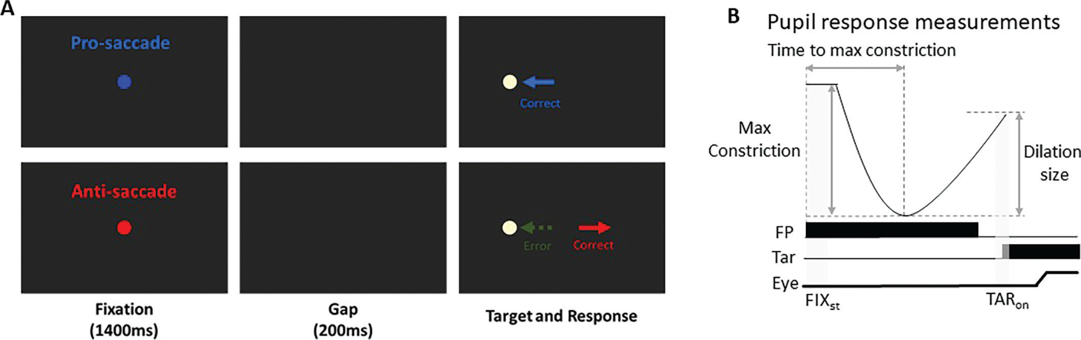 (A) Each trial started with a central colored fixation point on a black background. After 1400 ms, a blank screen was presented for 200 ms (gap) before target stimulus presentation. Participants were required to move their eyes to the stimulus in the pro-saccade condition, but move to the opposite location in the anti-saccade condition. Note that the displayed FP colors here are only for illustration of the paradigm. (B) Two selected epochs for pupil analyses: FIXst (fixation start): 0 - 200 ms after fixation onset; TARon (target onset): -50 - 50 ms after target onset. FP: fixation point, Tar: target, Eye: eye position.